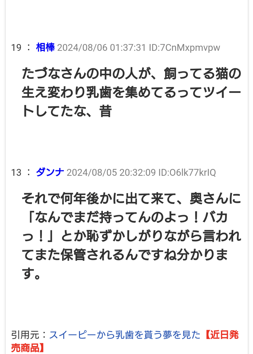 たづなさんの中の人が、飼ってる猫の生え変わり乳歯を集めてるってツイートしてたな、昔