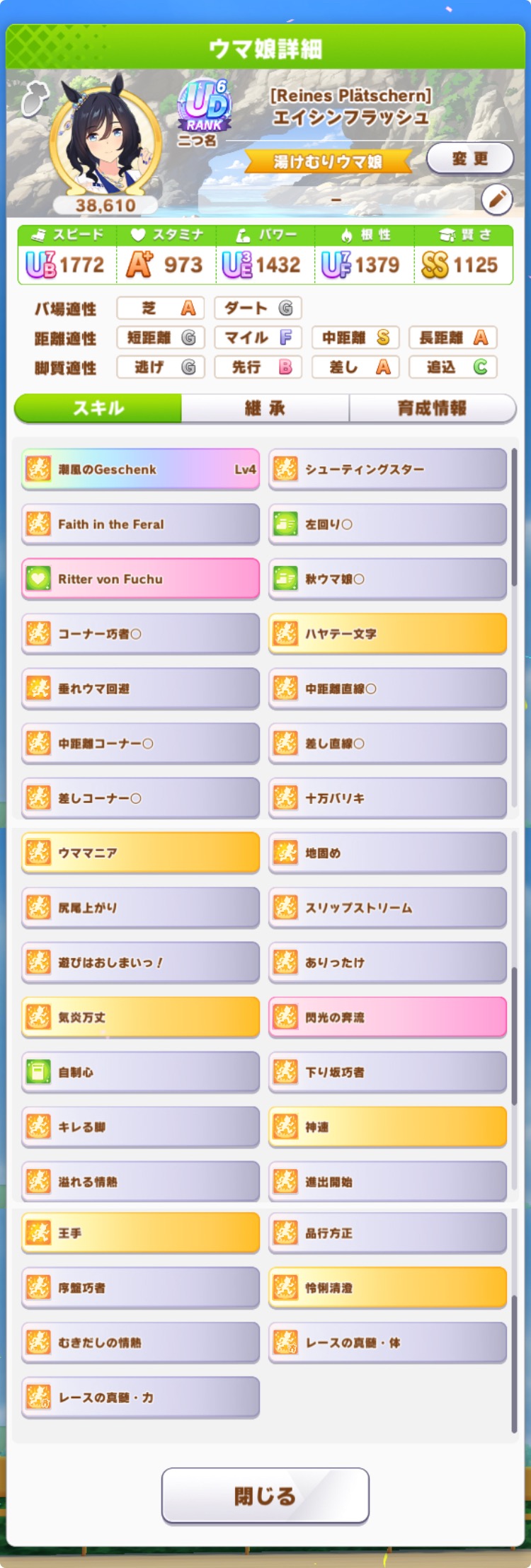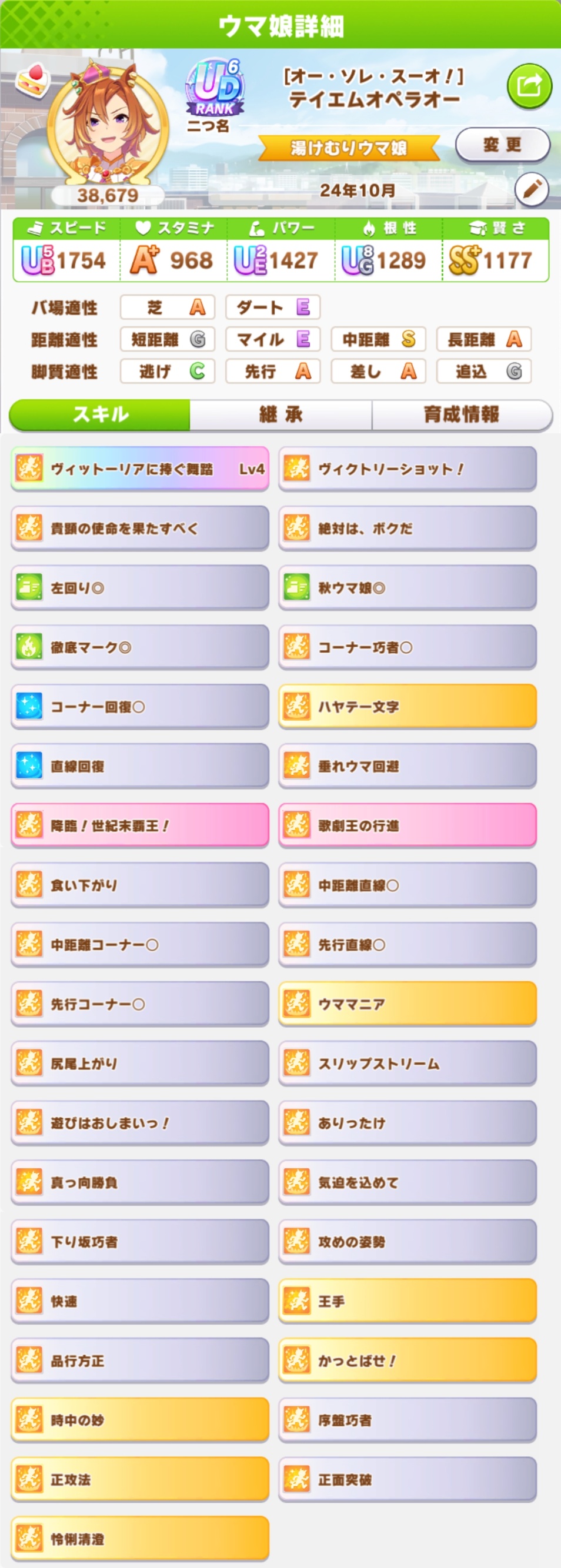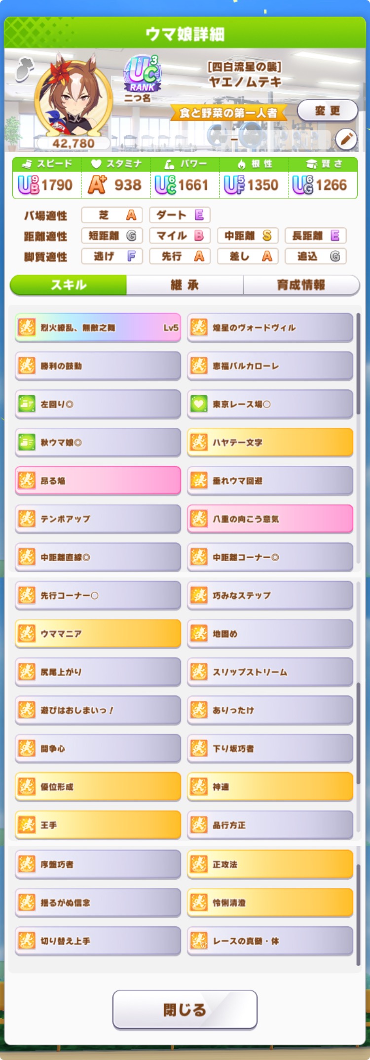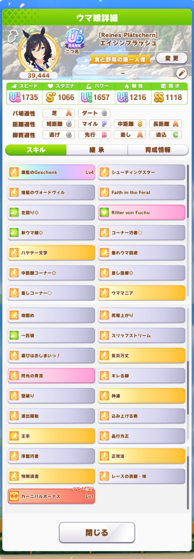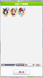 継承速度は何が良いだろうか…相性値まで拘るとタイキの親に継承速度仕込めないし、そもそも直線コーナー緑◎にすると継承速度が良くて2つしか取れない…