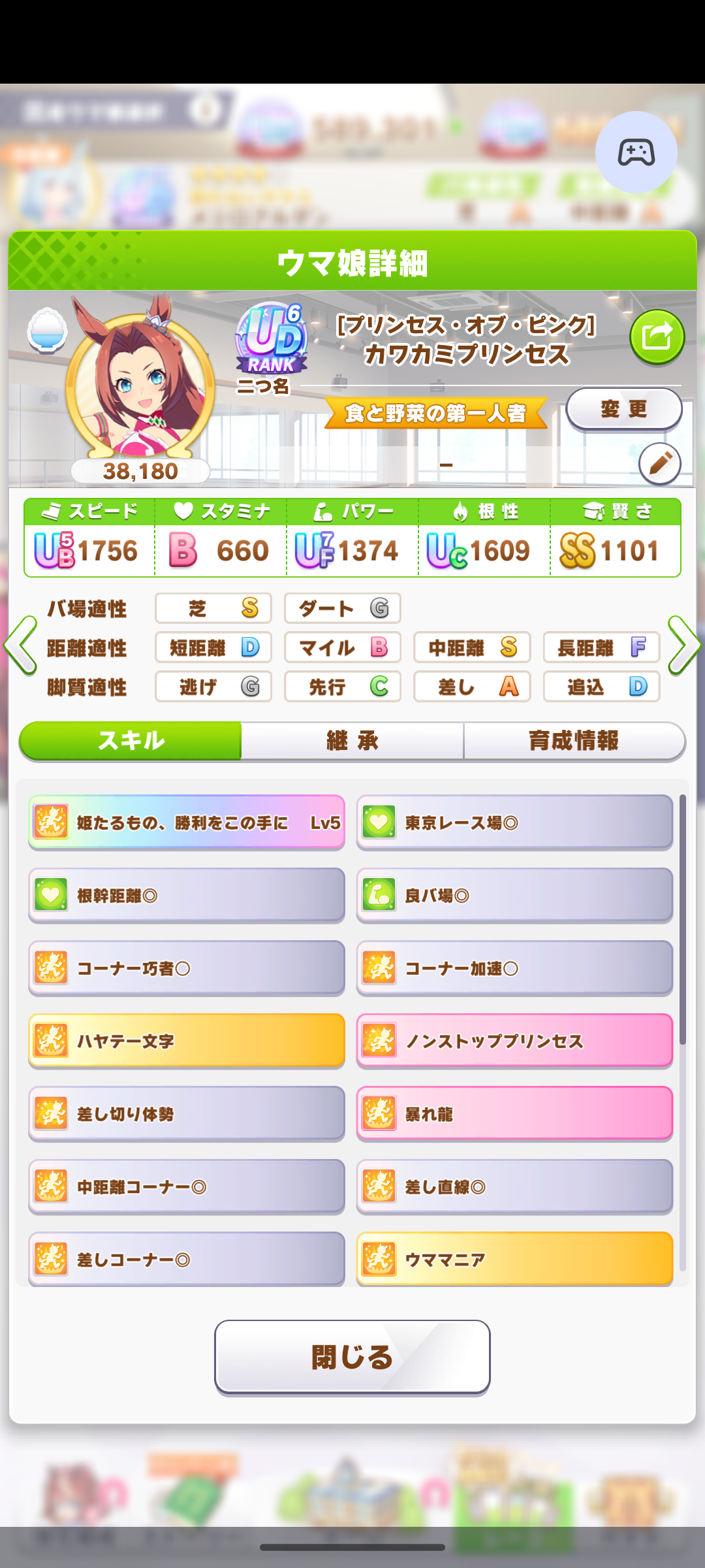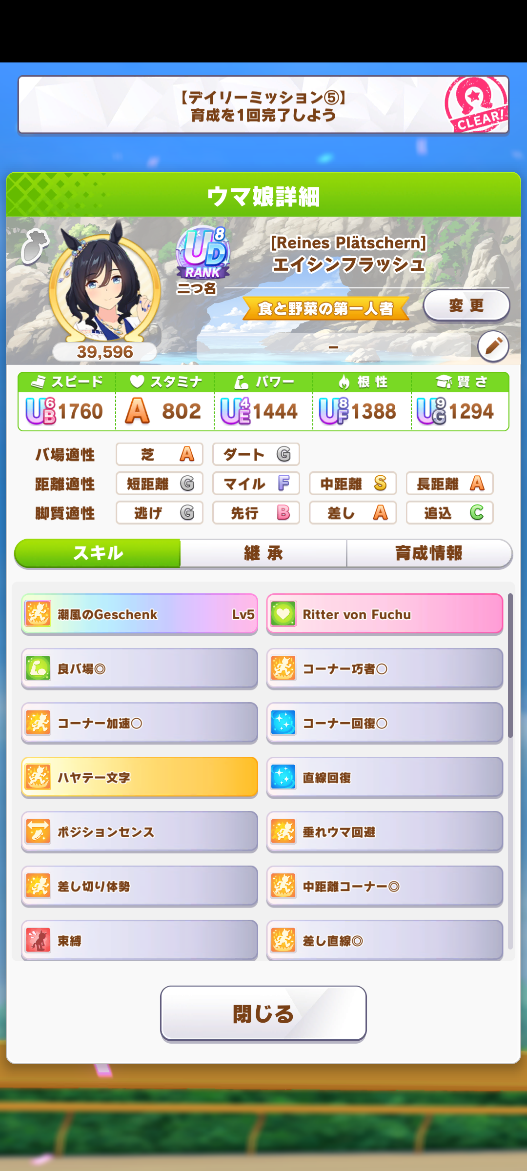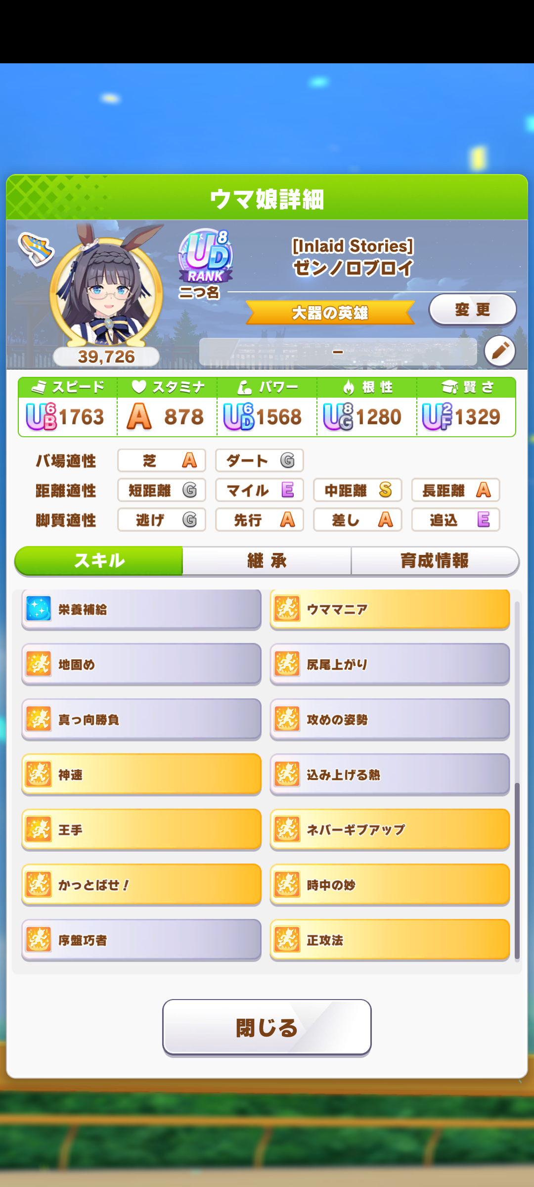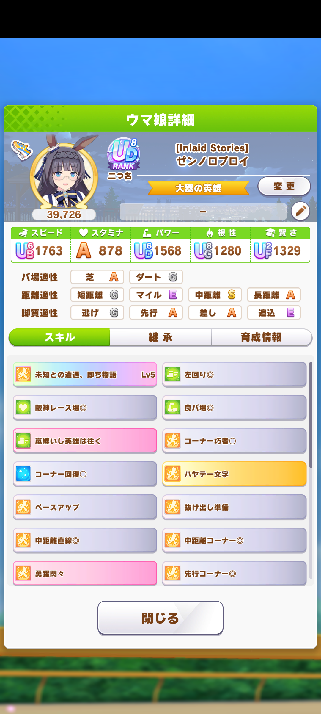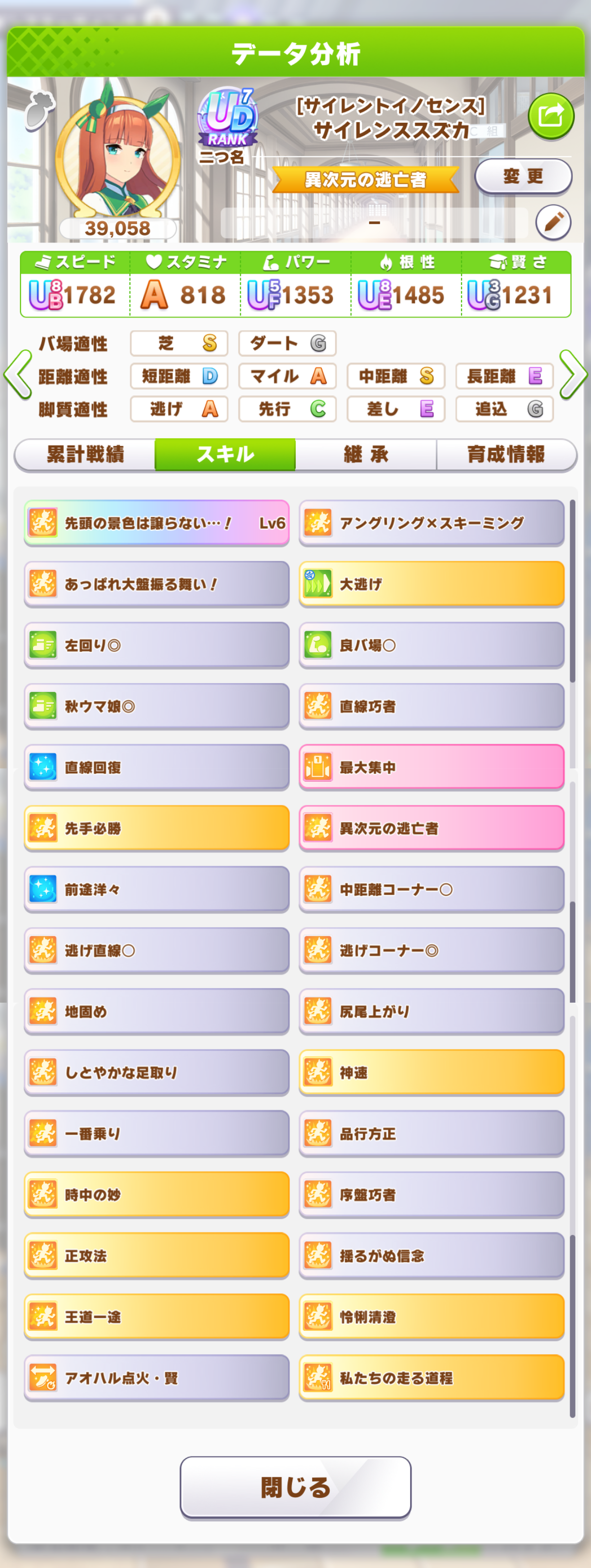 継承速度は何が良いだろうか…相性値まで拘るとタイキの親に継承速度仕込めないし、そもそも直線コーナー緑◎にすると継承速度が良くて2つしか取れない…
