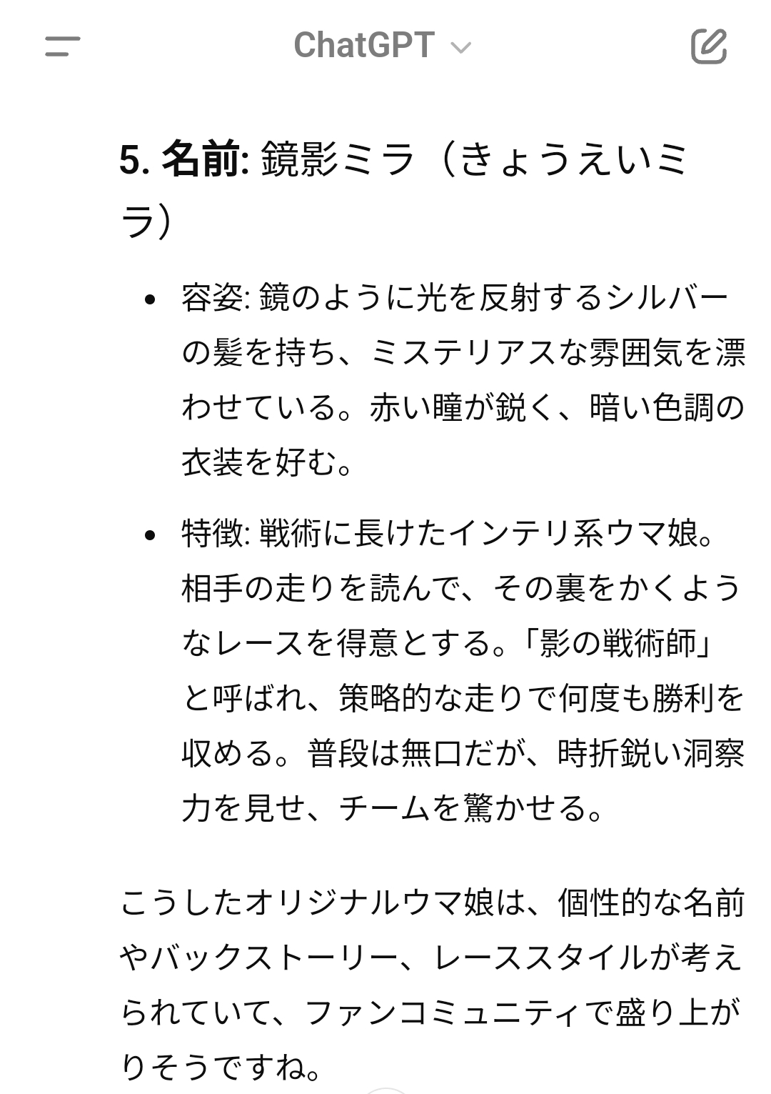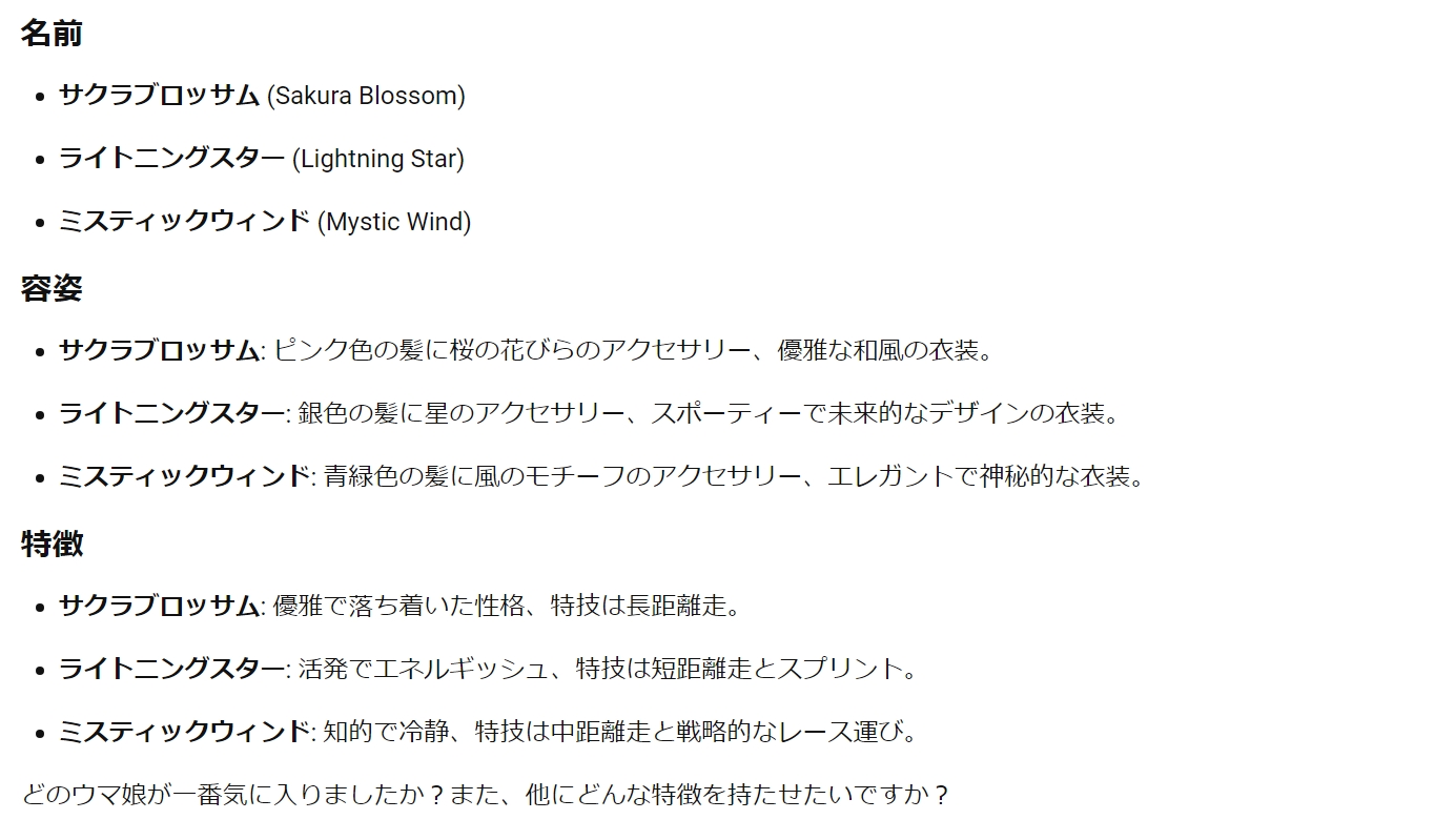 Q.ウマ娘BBSで登場しそうなオリジナルウマ娘の名前や容姿、特徴を教えてください