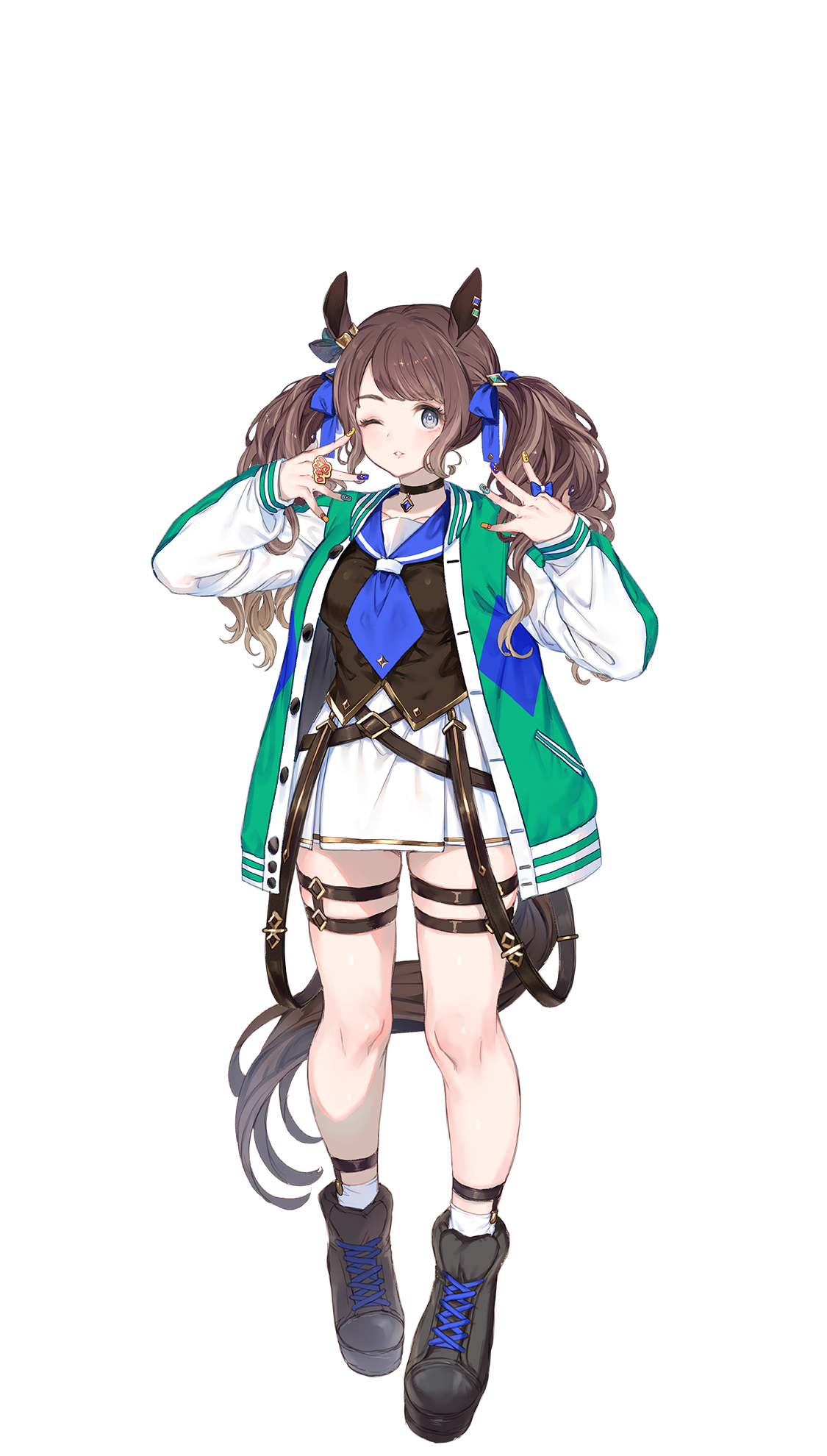 その短剣でモチーフ元勝負服の青服・赤袖・茶たすきのたすきを表現