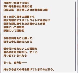 🎨トレ「月明かりがなぞり描くウッ 深い青を秘めた漆黒の髪ウッ 白磁の肌ウッ 星を閉じ込めた紫水晶の瞳ウッ煌々と輝く真冬の銀盤すらウッ 彼女を照らすスポットライトに過ぎないウッ 豪奢な額に飾られた名画のごとき姿ウッ 優美にして蠱惑的ウッ 静謐にして躍動的ウッ今ある時を丸ごと掬ってウッ、 硝子の中に収められたらウッ値の付けられないこの瞬間をウッ 溜め息を吐きながらウッ、ずっとウッ、 見つめていられたらウッきっとウッ、自分はウッ―――持ちうる全ての時を捧げてしまうのだろうウッ。」
