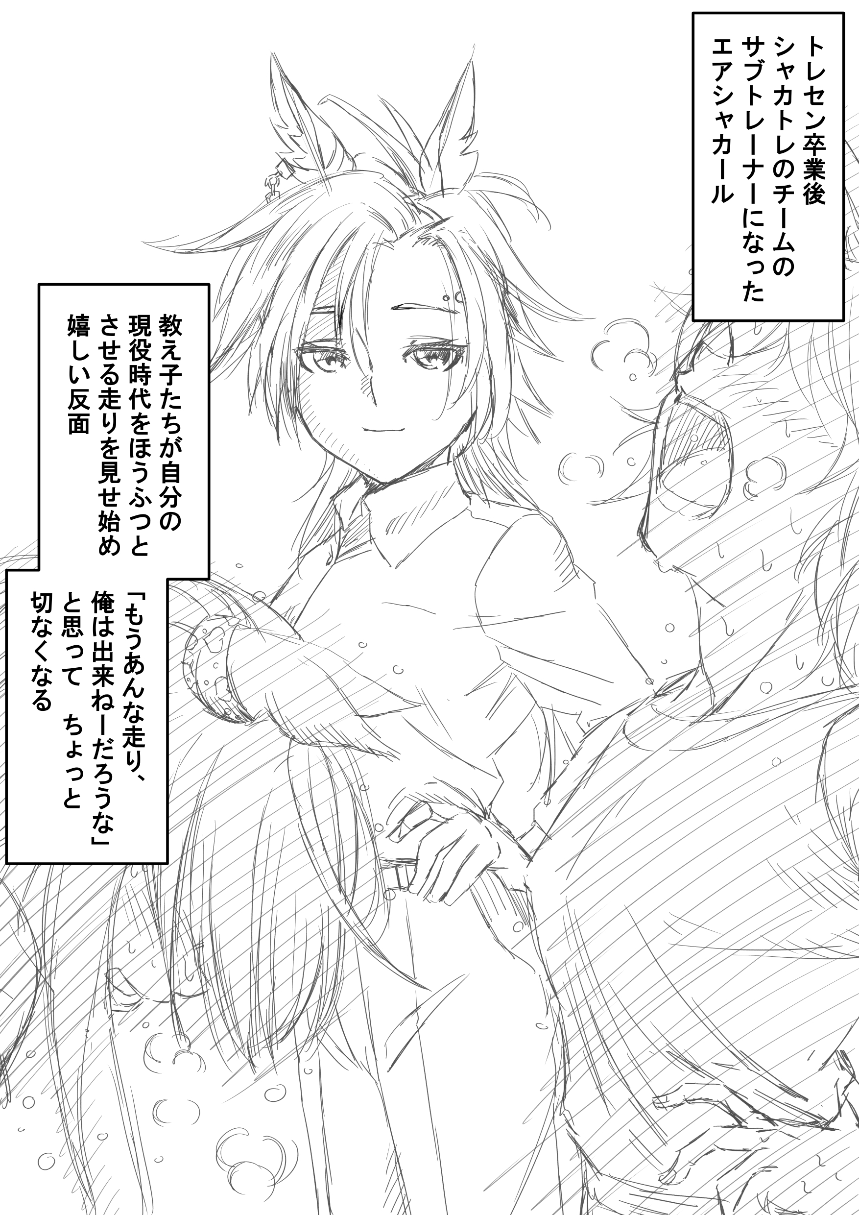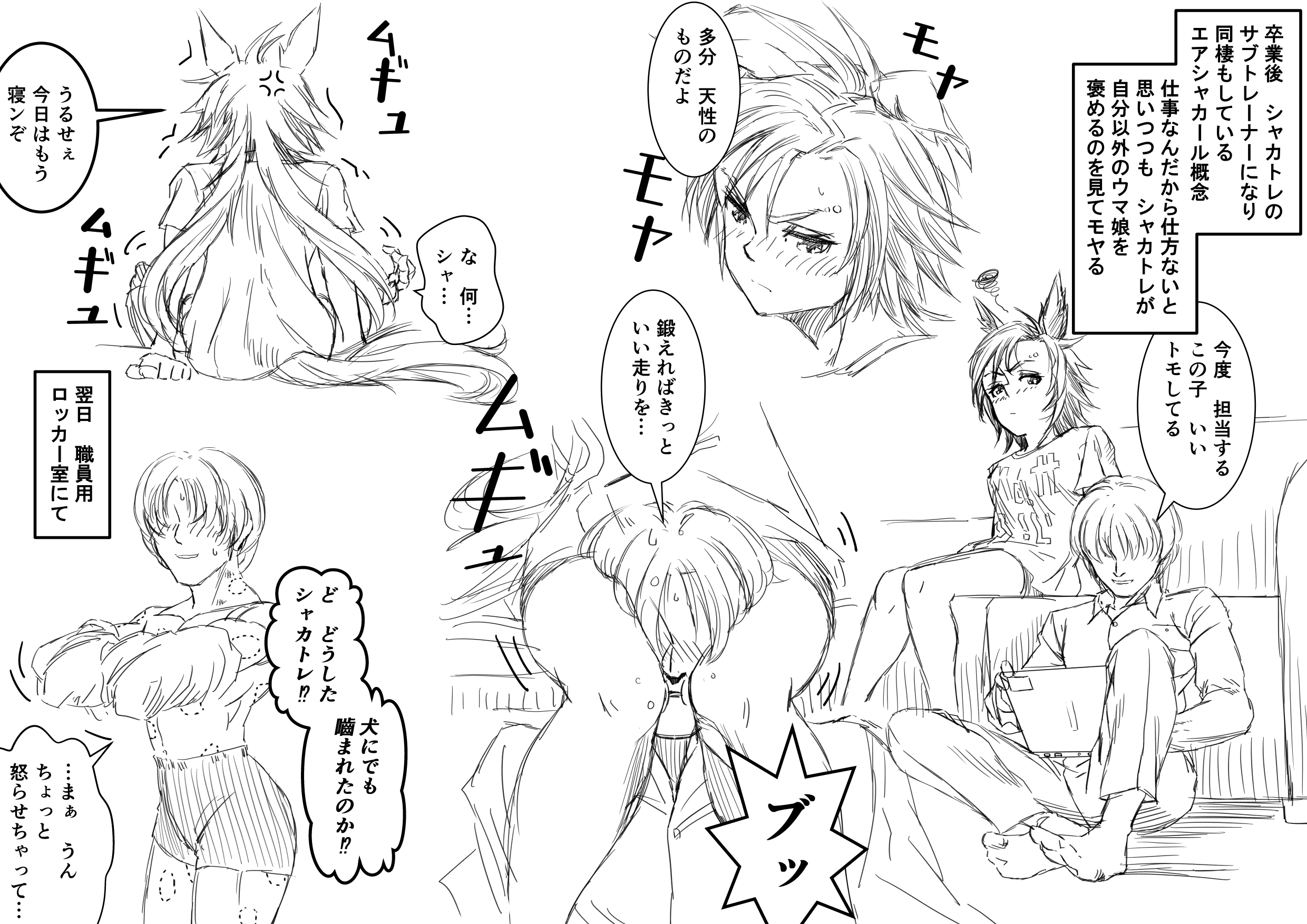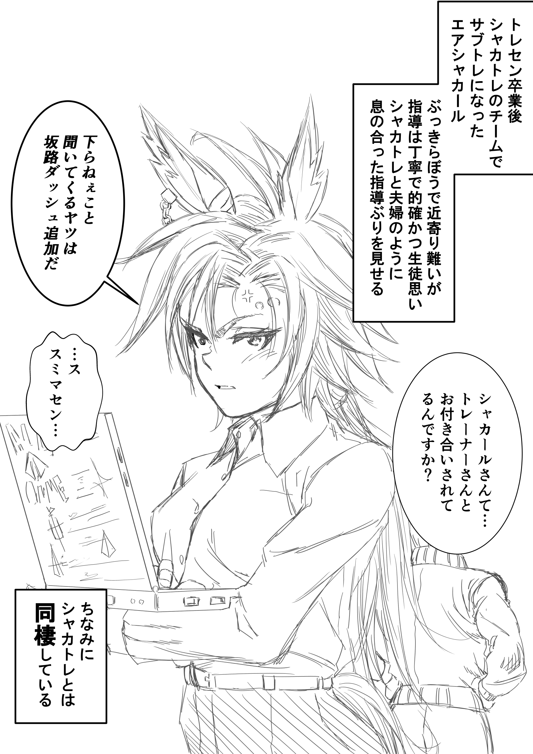 教え子達に「お二人って何だか夫婦みたいですね!」って言われて「ア"ぁ!?何フザケた事言ってンだ!坂路ダッシュ増やされてェか!?」って顔真っ赤にしてキレるシャカール