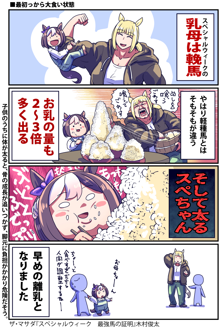 そのまま人体に比を持ち込むなら大雑把に100kg前後の輓馬ちゃんと50kg前後のウマ娘ちゃんというビジュアルになる。