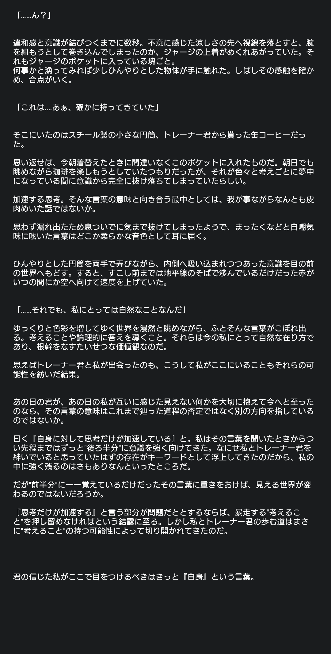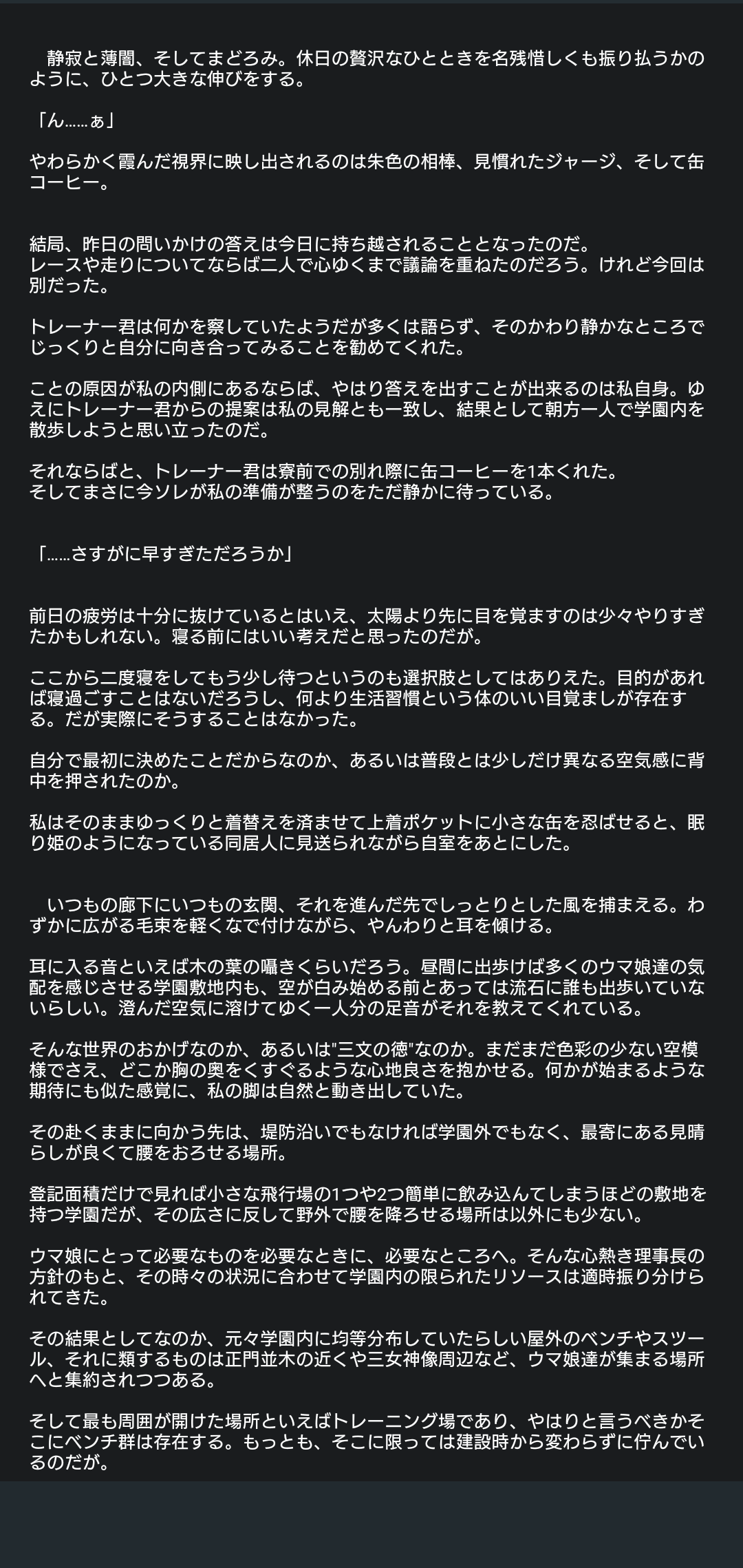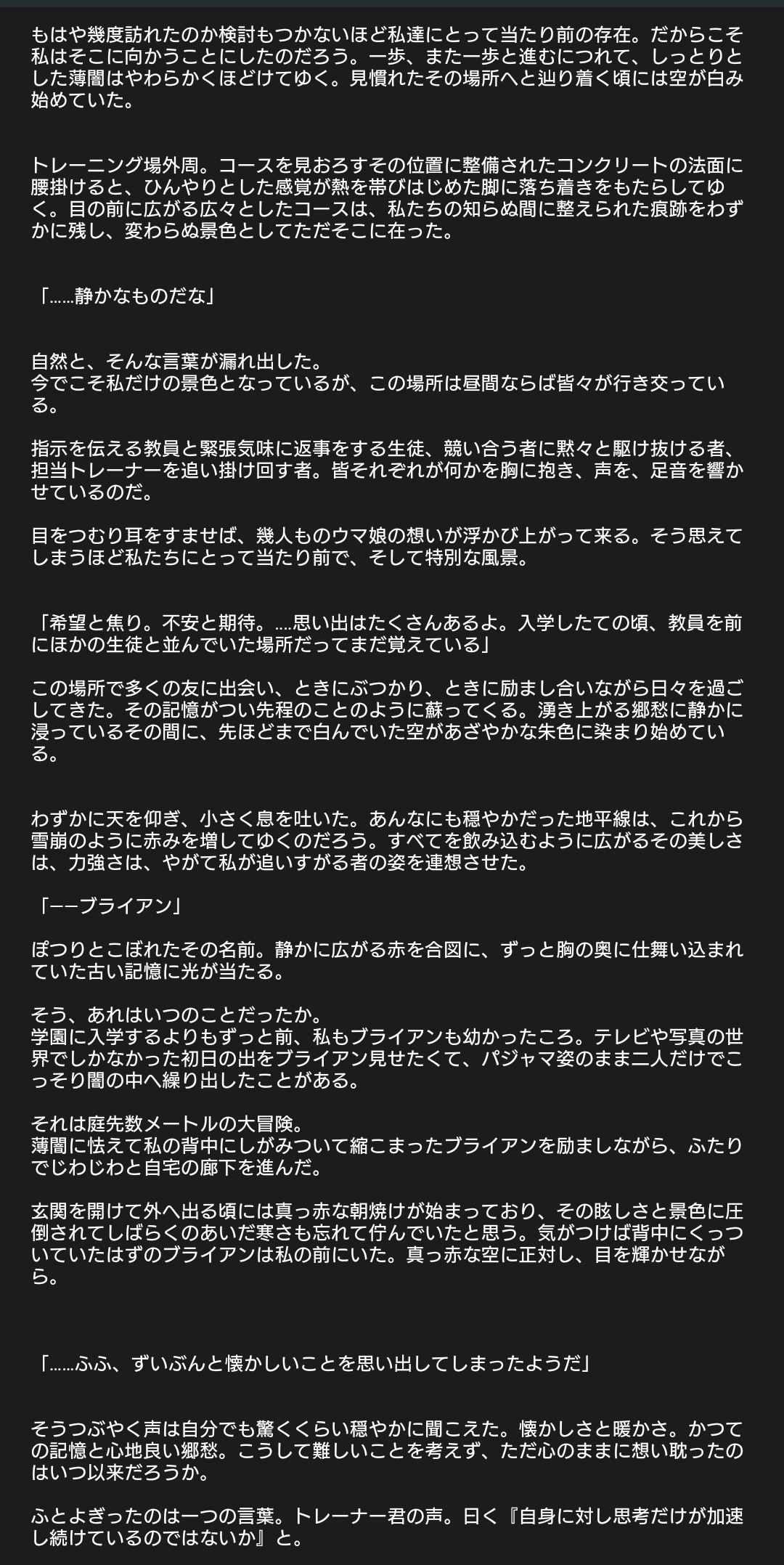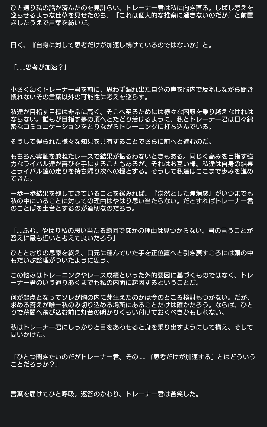 思いつきで書き殴ったから文体乱れまくってるけどトレーナーの発言は[]にまとめたほうが楽っぽい