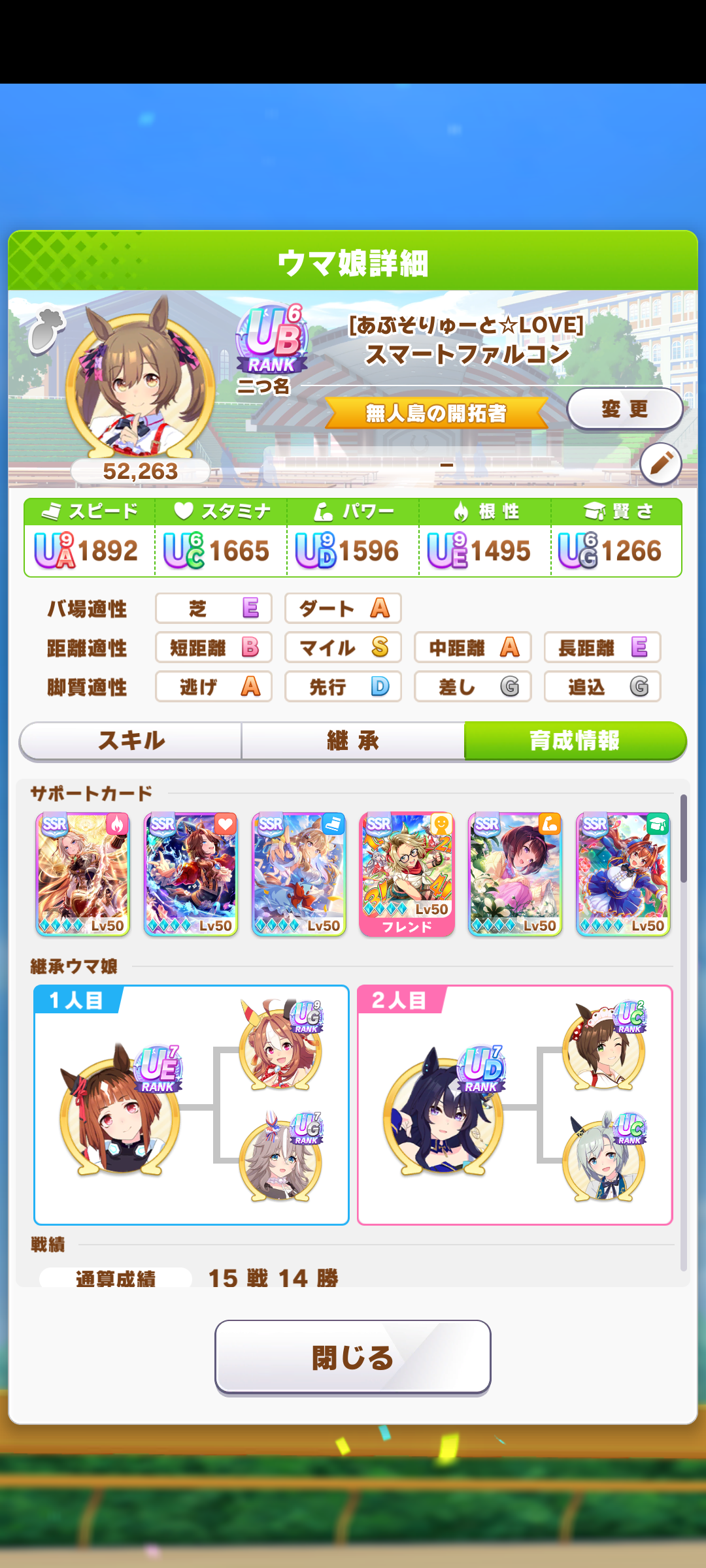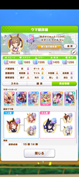 始めて半年、ほぼ無課金(プレパスと因子再獲得のみ)、まともなサポカはアモアイと賢さルドルフだけで、残りは配布のみ