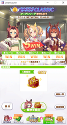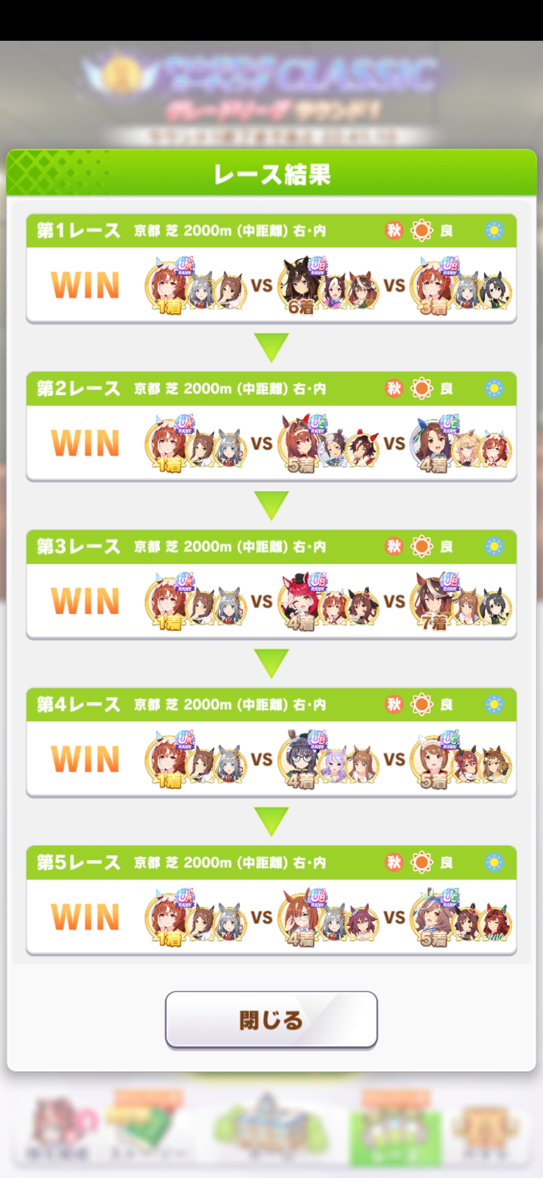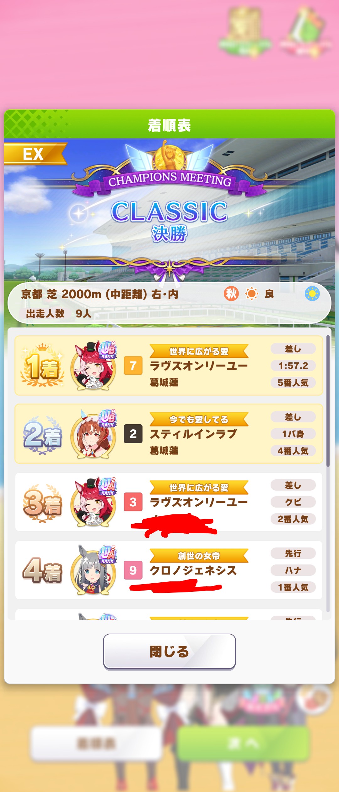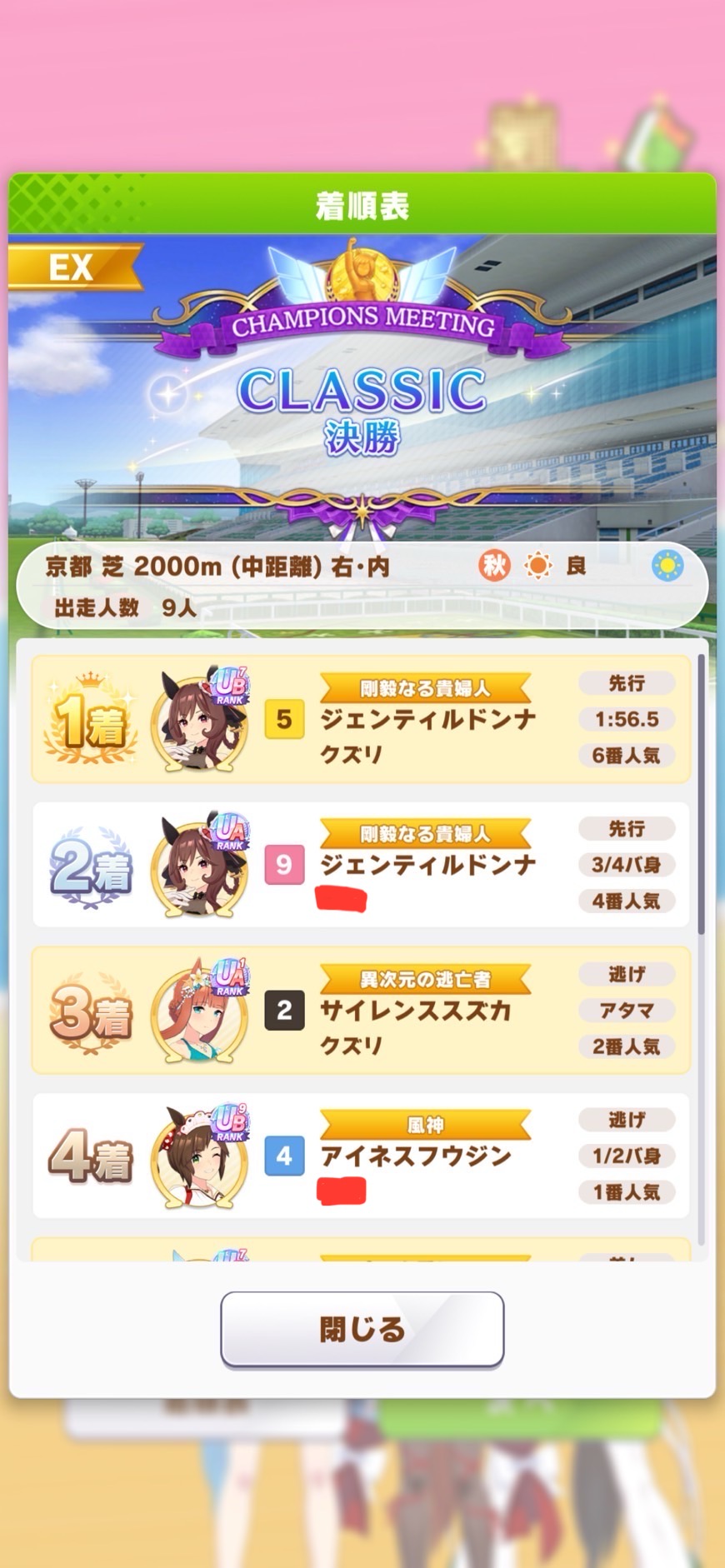 相手の編成は大逃げスズカさん、チョコアイネス、ドンナ。こちらは大逃げ水着スズカさん、ドンナ、スティル。ハナを取らなければ確実に負ける中、なんとスズカさんは掛かってくれて、それもあってかハナを取ることに成功。さらにそのまま最終コーナーまで先頭に立ち続け、アイネスに抜かれる前にギリギリで固有やアンスキを発動。アイネスに先頭を譲るもすぐに取り返し、そのまま最終直線を突っ走っていく。その裏で、うちのジェンティルも3番手につけていた。そしてゴール版直前でうちのドンナ、そして相手のドンナがスズカさんを差していった……3/4馬身差でうちのドンナが1着、続いて相手のドンナ、うちのスズカさん。グレBとはいえあまりにも怒涛の展開で、見ててすごく興奮したし、こういう形で勝てるとは思ってなかったから、ほんとに嬉しかった