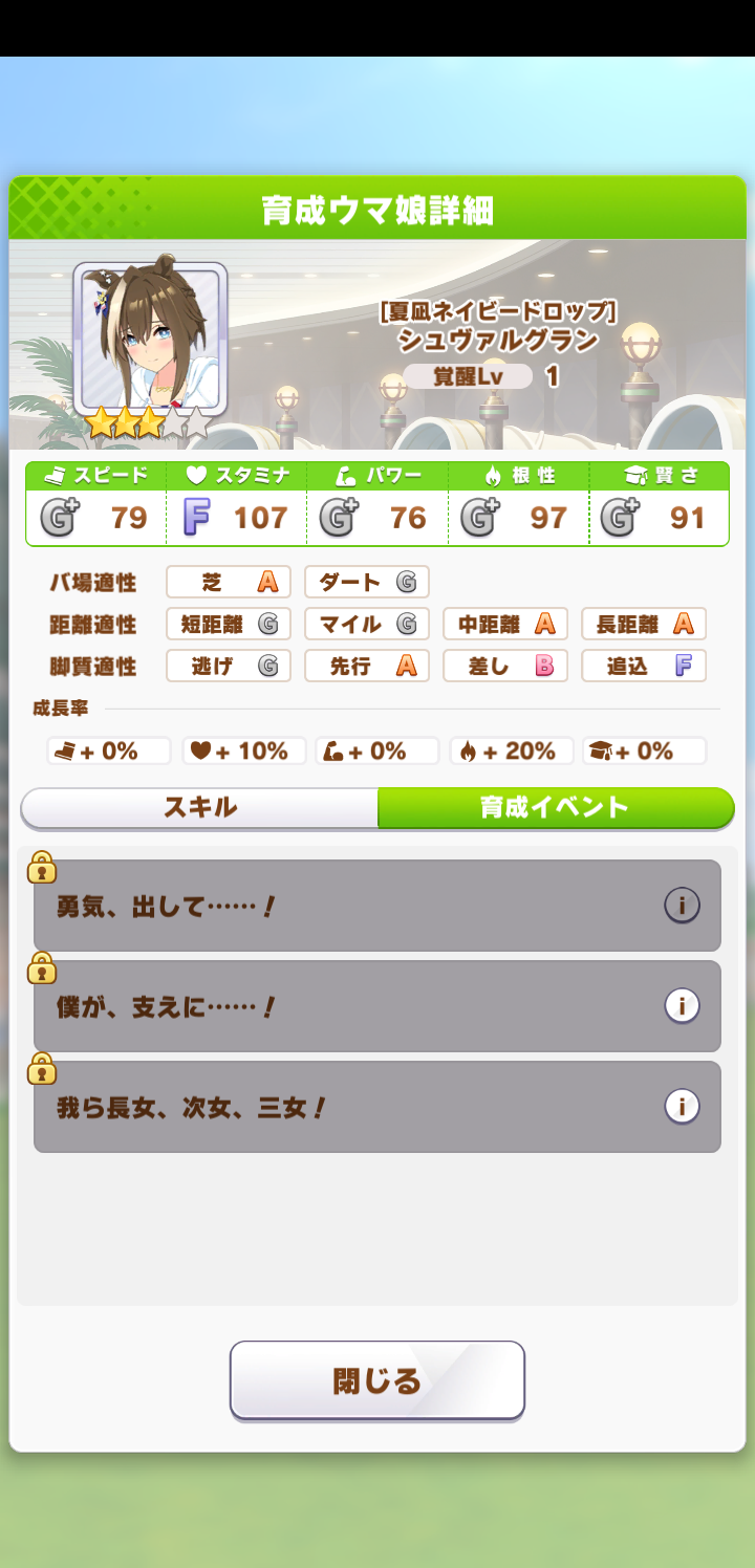 今回の水クラウン、水シュヴァちは両方夏合宿中に体力回復イベントあるから育成がいくらか楽だわ