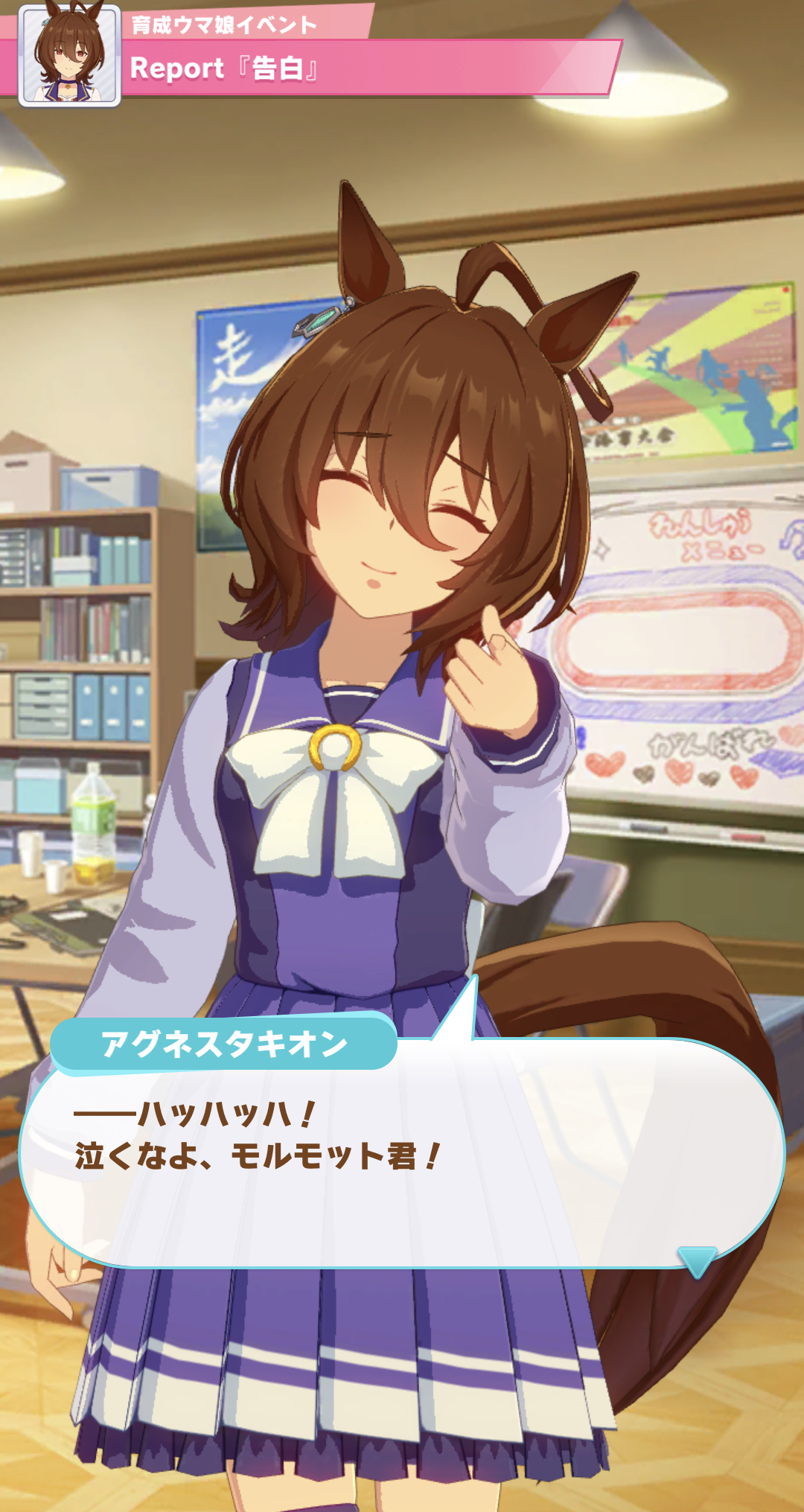 メインストーリーも良かったよね。有馬記念のスペちゃんにチームシリウス継承させるのを何となく察してたけど、グラスに勝って欲しくて敢えて外して、不撓不屈見せてもらった。