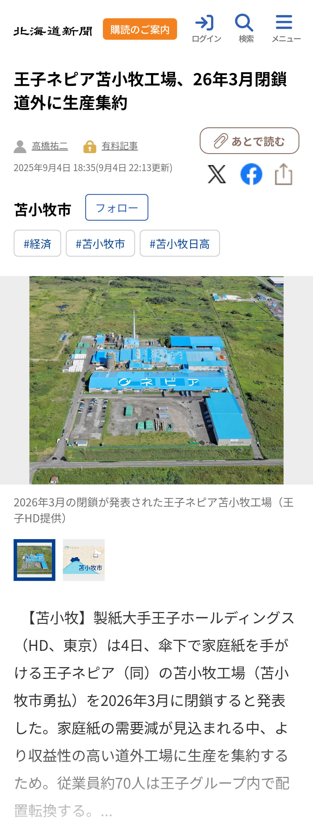 王子、苫小牧と東京の子会社2工場閉鎖 トイレットペーパーなど生産