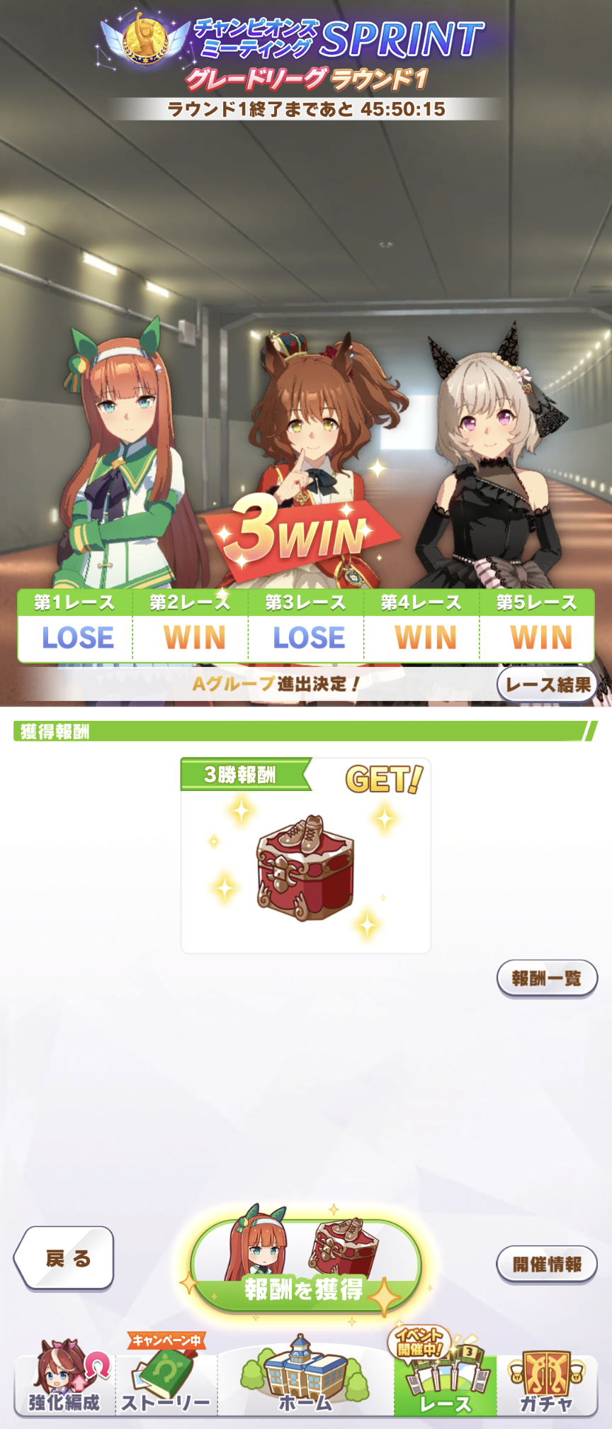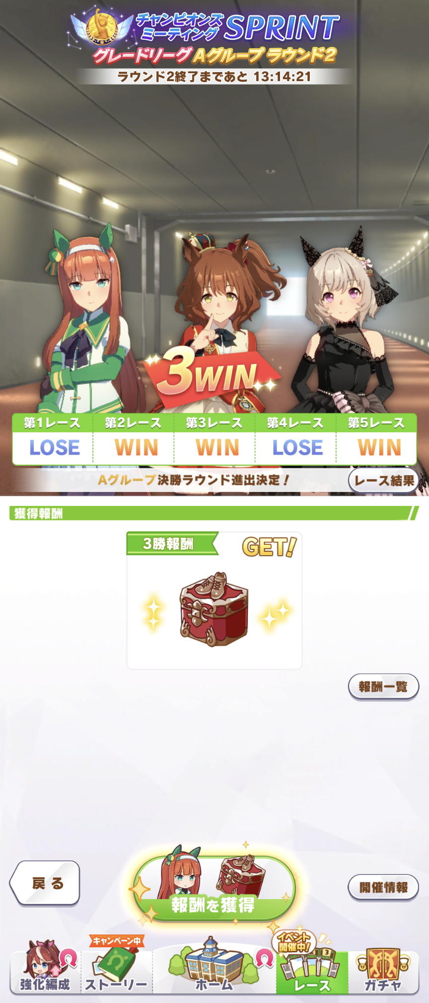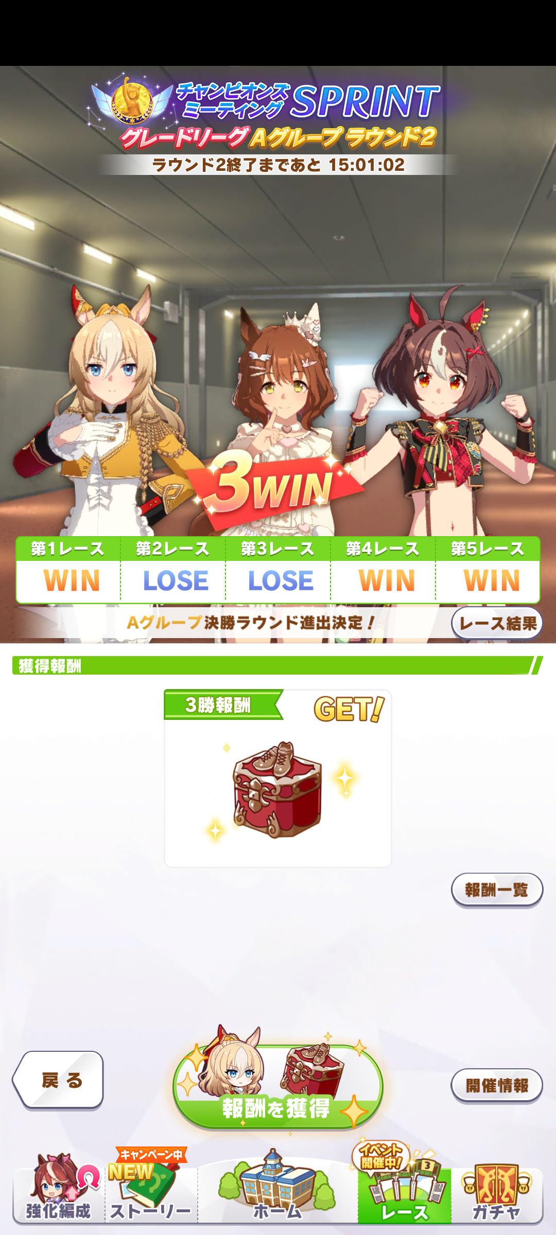 勝てはしたけど勝ったのがチムレ用に昔作ったマーチャンでスキルも大分適当、距離Sにすらなってないという…