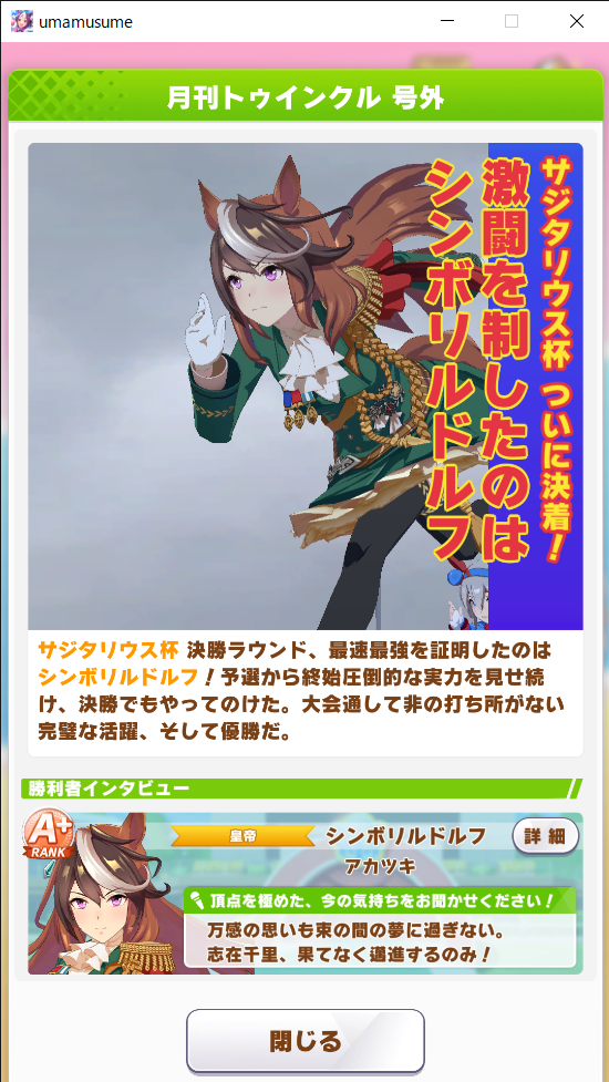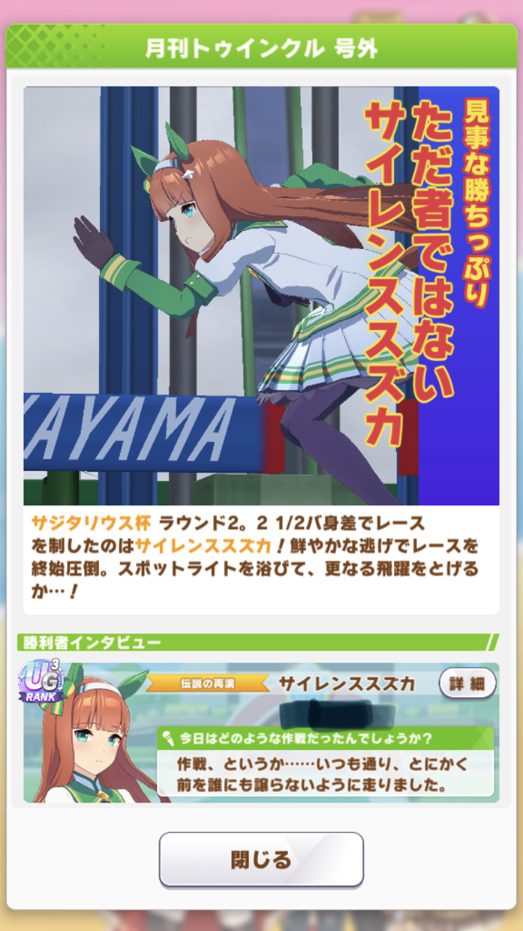勝ち申した! 差し育成の材料も環境もようやく揃ってきたから、これで遠慮も躊躇もなく差しウマ娘を投入できる