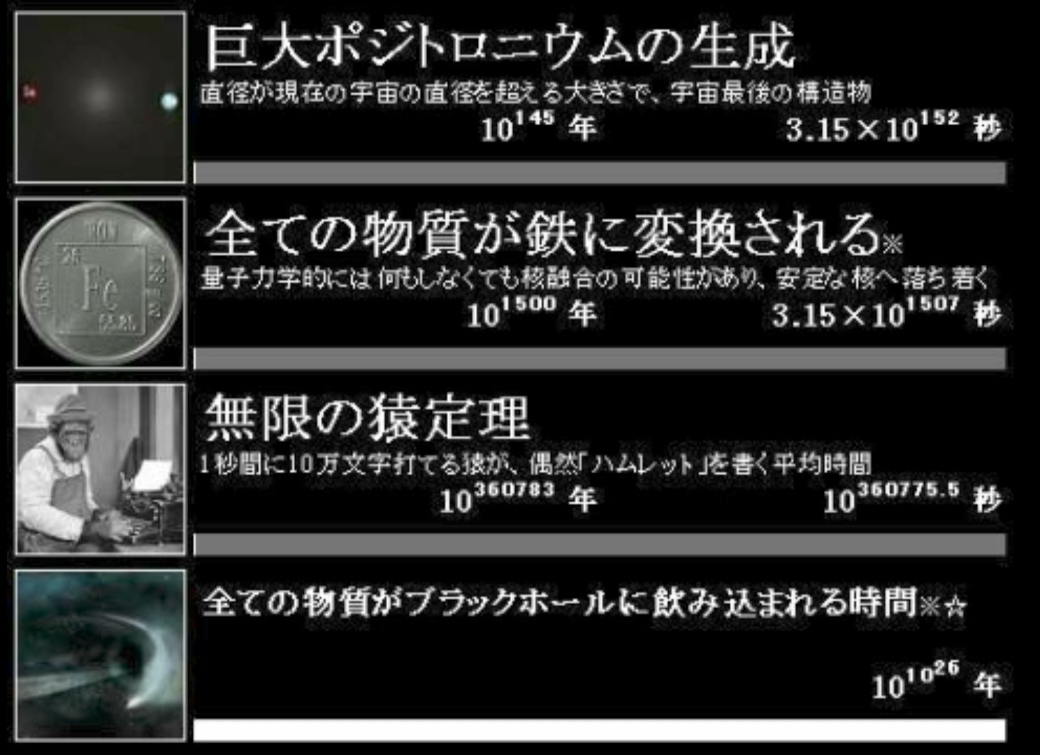 例えば1時間に10万文字打てる猿が偶然にシェイクスピアの戯曲ハムレットを書き上げるまでの平均年数は10の360783乗年程とされている