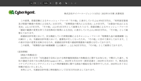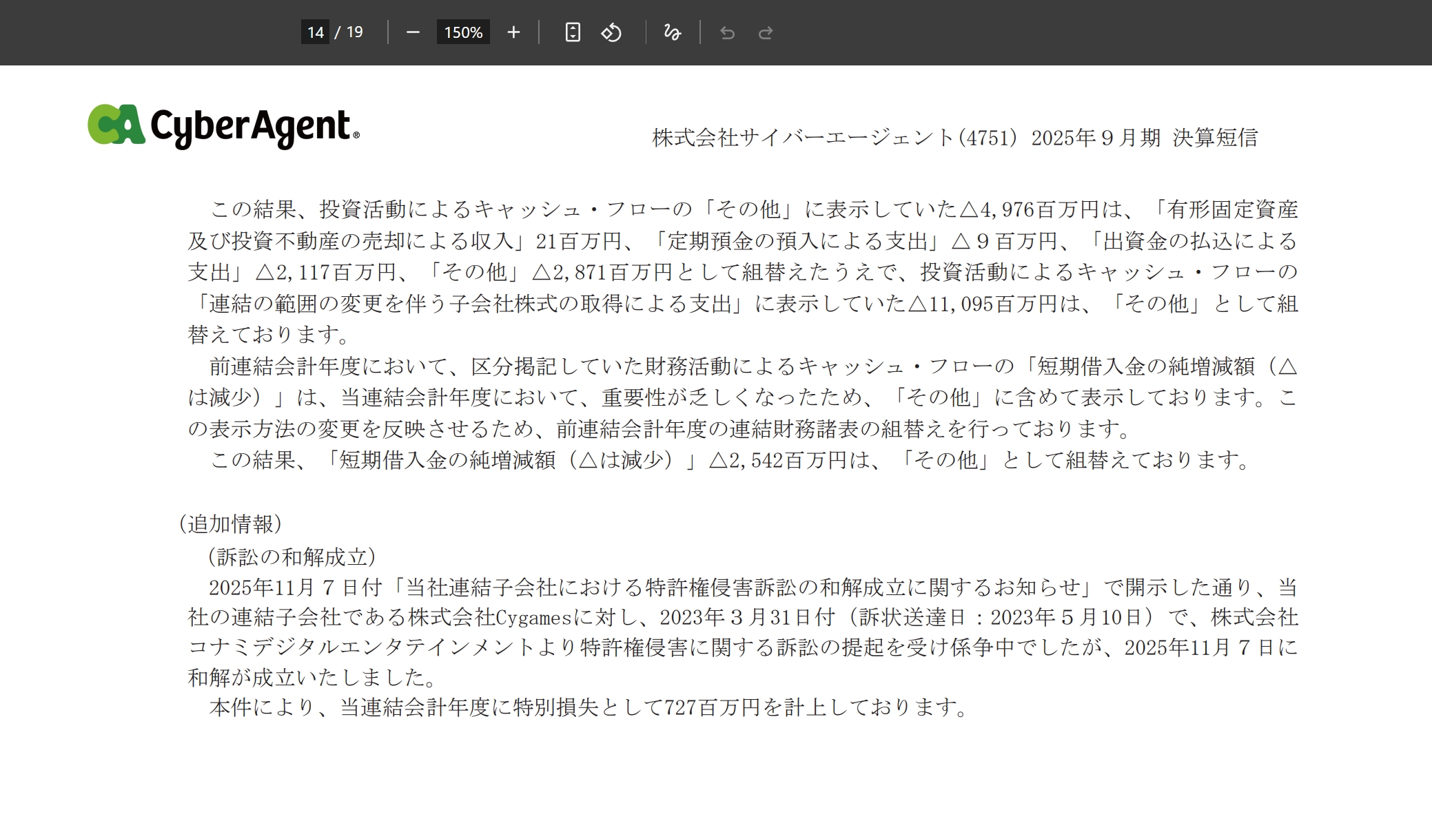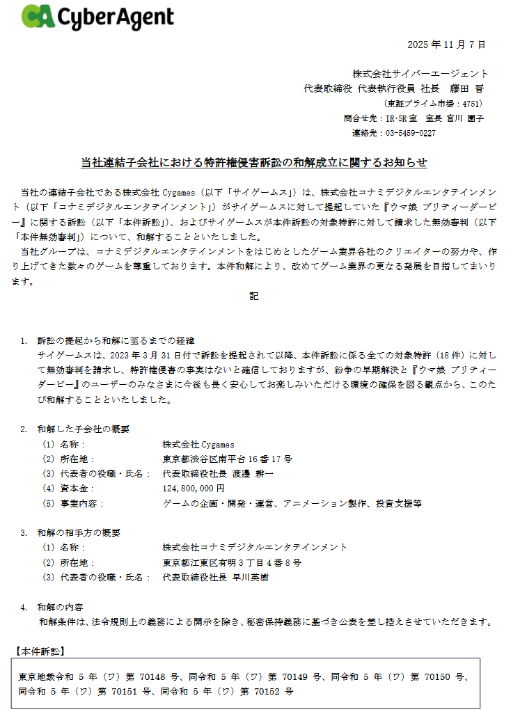 >2025年11月7日付「当社連結子会社における特許権侵害訴訟の和解成立に関するお知らせ」で開示した通り、当社の連結子会社である株式会社Cygamesに対し、2023年3月31日付(訴状送達日:2023年5月10日)で、株式会社コナミデジタルエンタテインメントより特許権侵害に関する訴訟の提起を受け係争中でしたが、2025年11月7日に