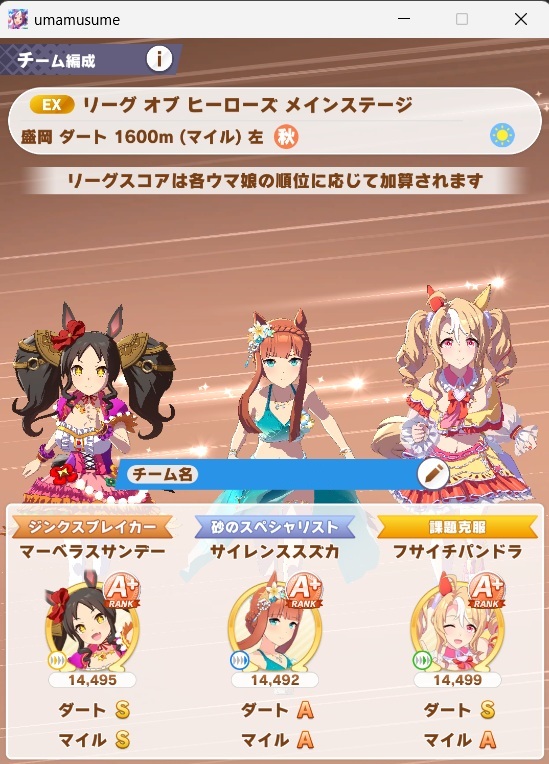 (チャンミと違ってゴールド帯までランクソート効いてくれる+ダートでこれくらいのランク帯ならスタミナを甘く見て低くしてるSS+まで喰える)