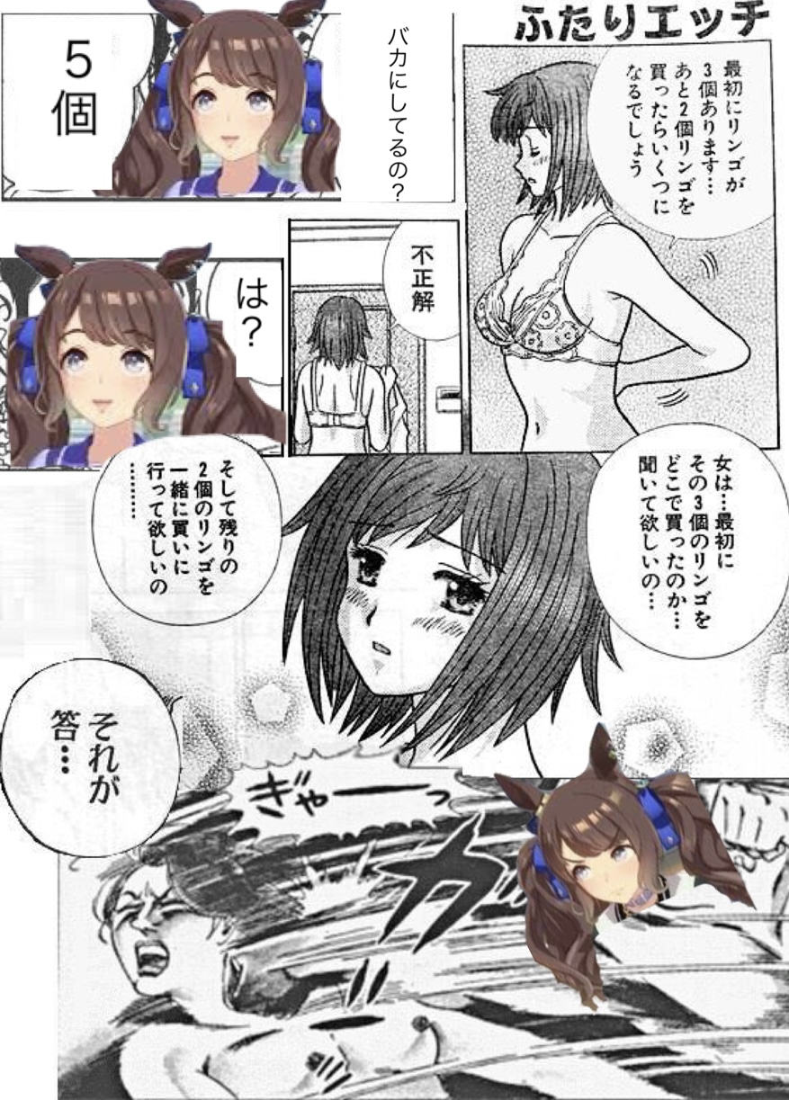 メジロパーマー:女は…最初にその3個のリンゴをどこで買ったのか…聞いて欲しいの…そして残りの2個のリンゴを一緒に買いに行って欲しいの………それが答え…