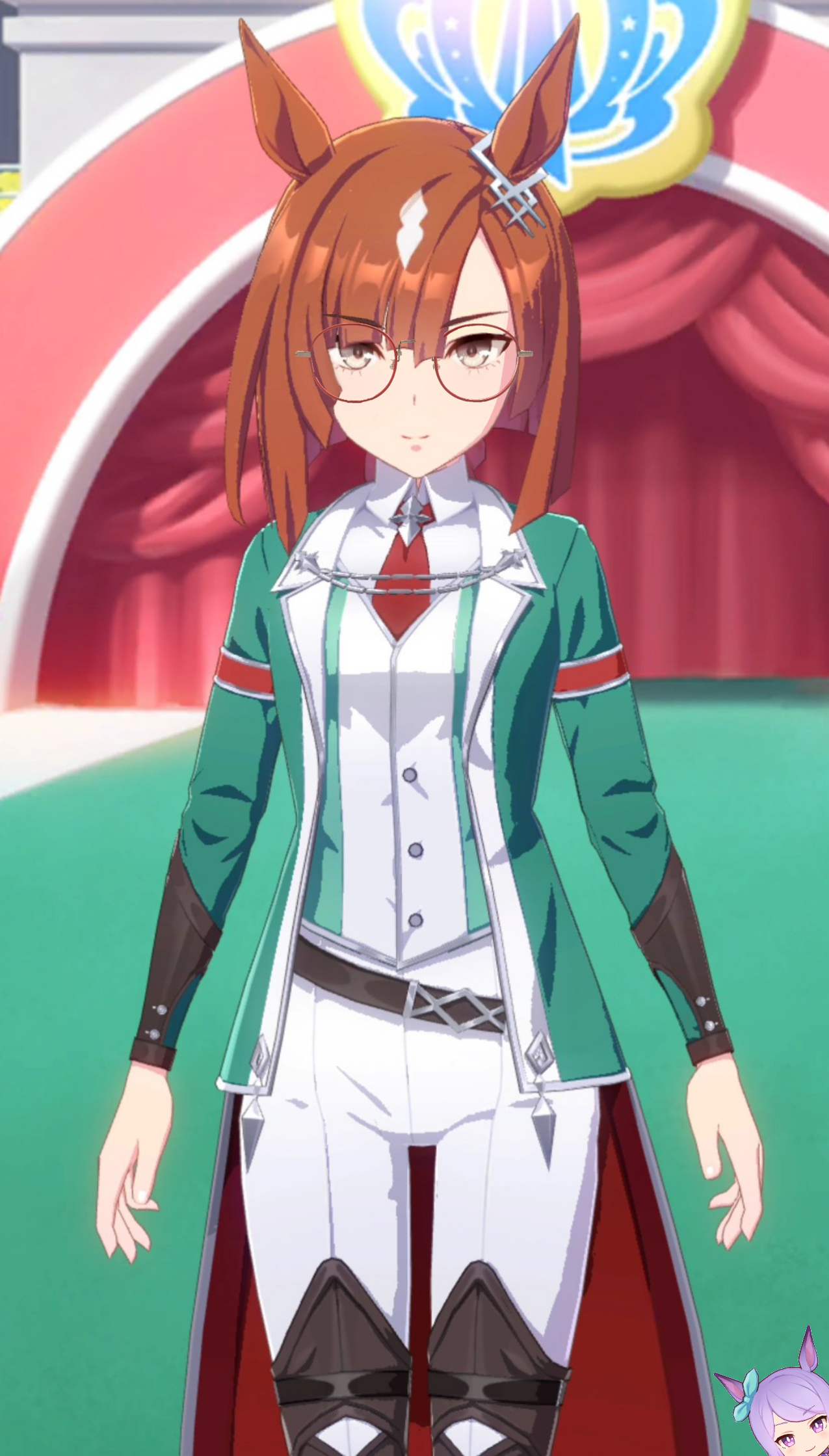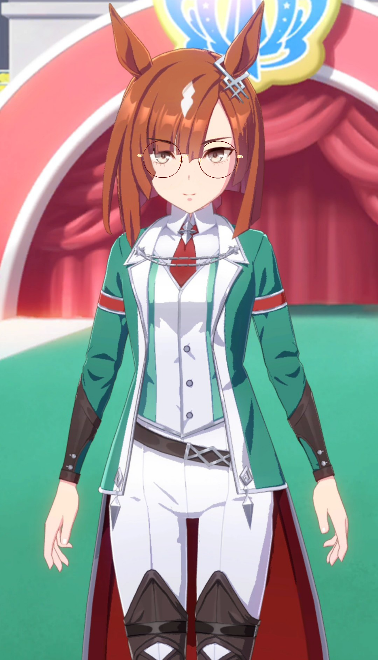 赤も悪くないかなと思っておりましたがよく見るとイクノさんの勝負服裏地〜腕の赤〜ネクタイにかけて△を形成しておりその頂点にイクノさんのお顔が来ておりますので赤いメガネを入れると全体的に赤の□のようなシルエットになって少しトップヘビーな印象になってしまう気がしますの。あとは栗毛を押しのけて強く主張してしまうようで少し重たくなってしまう気もしました