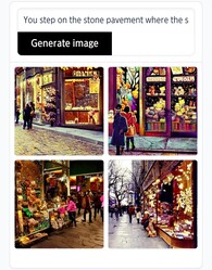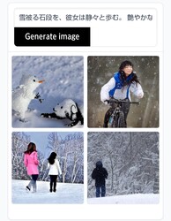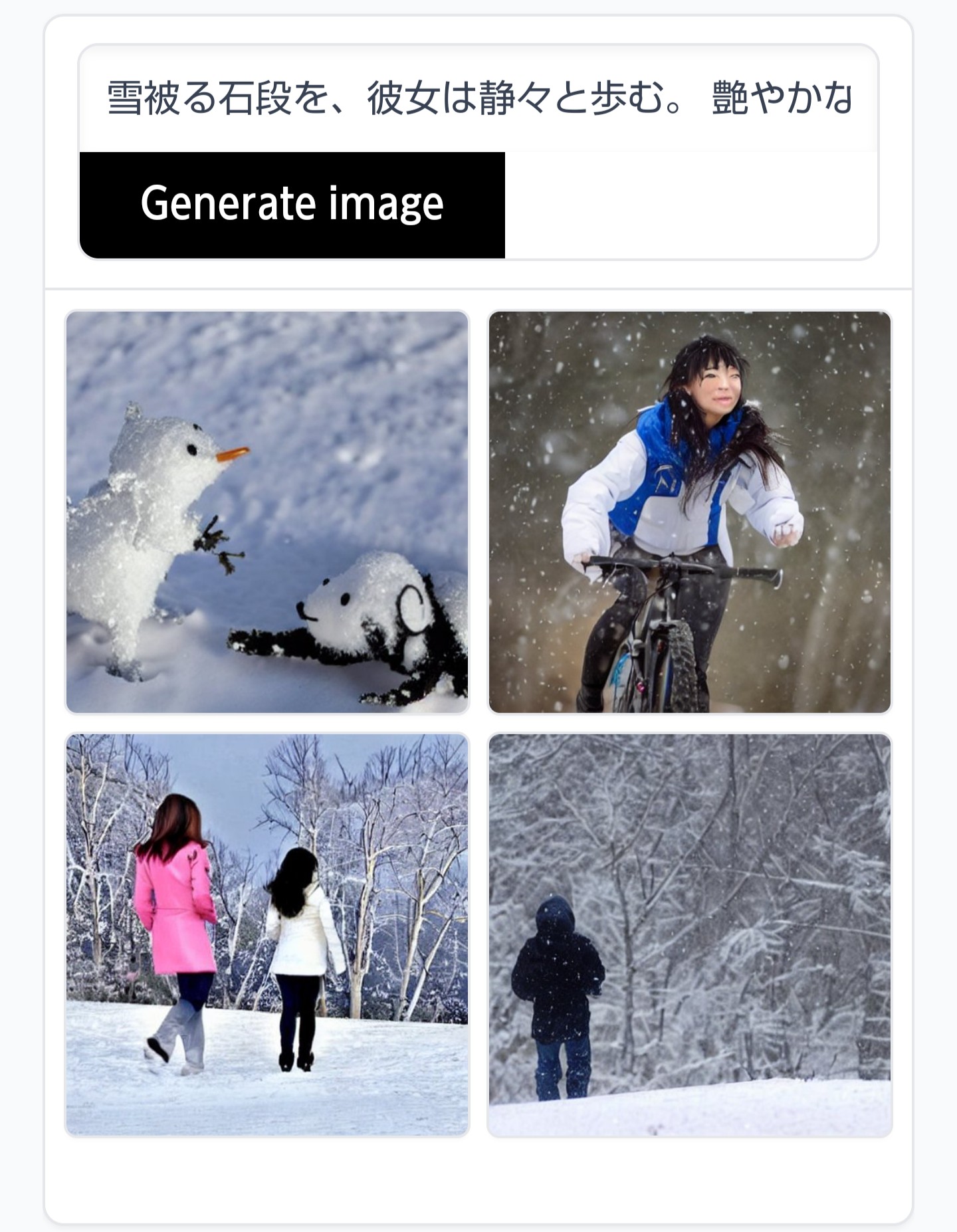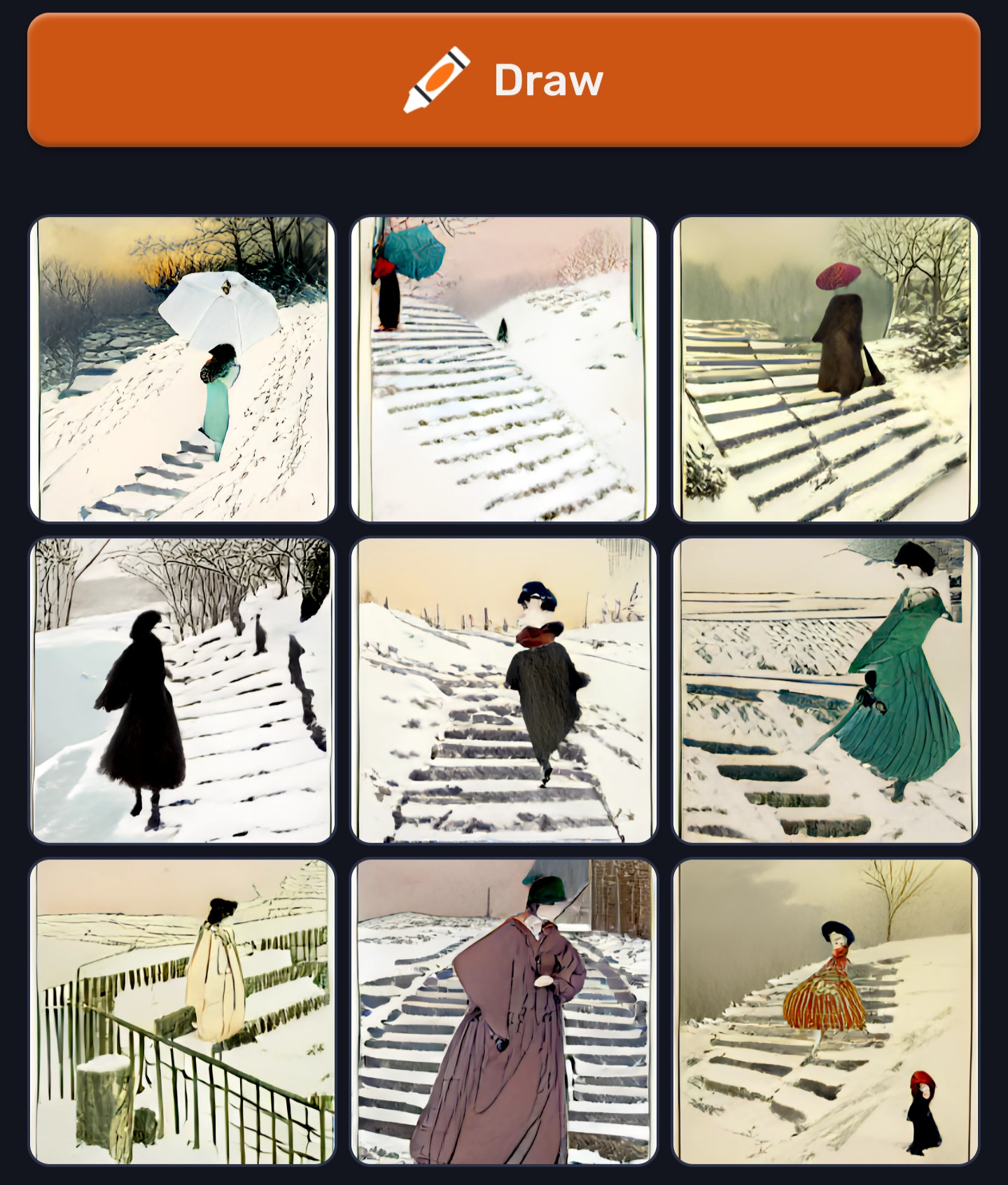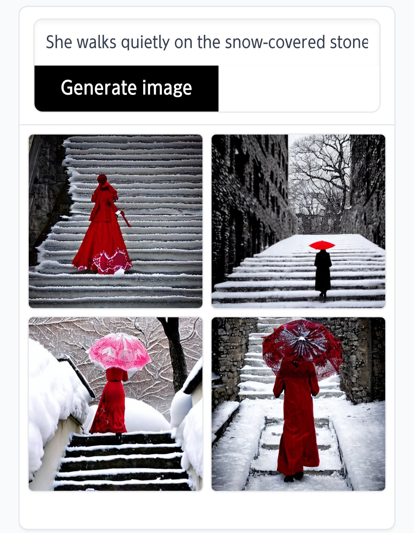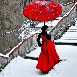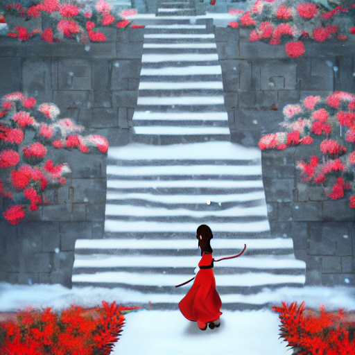 She walks quietly on the snow-covered stone steps.