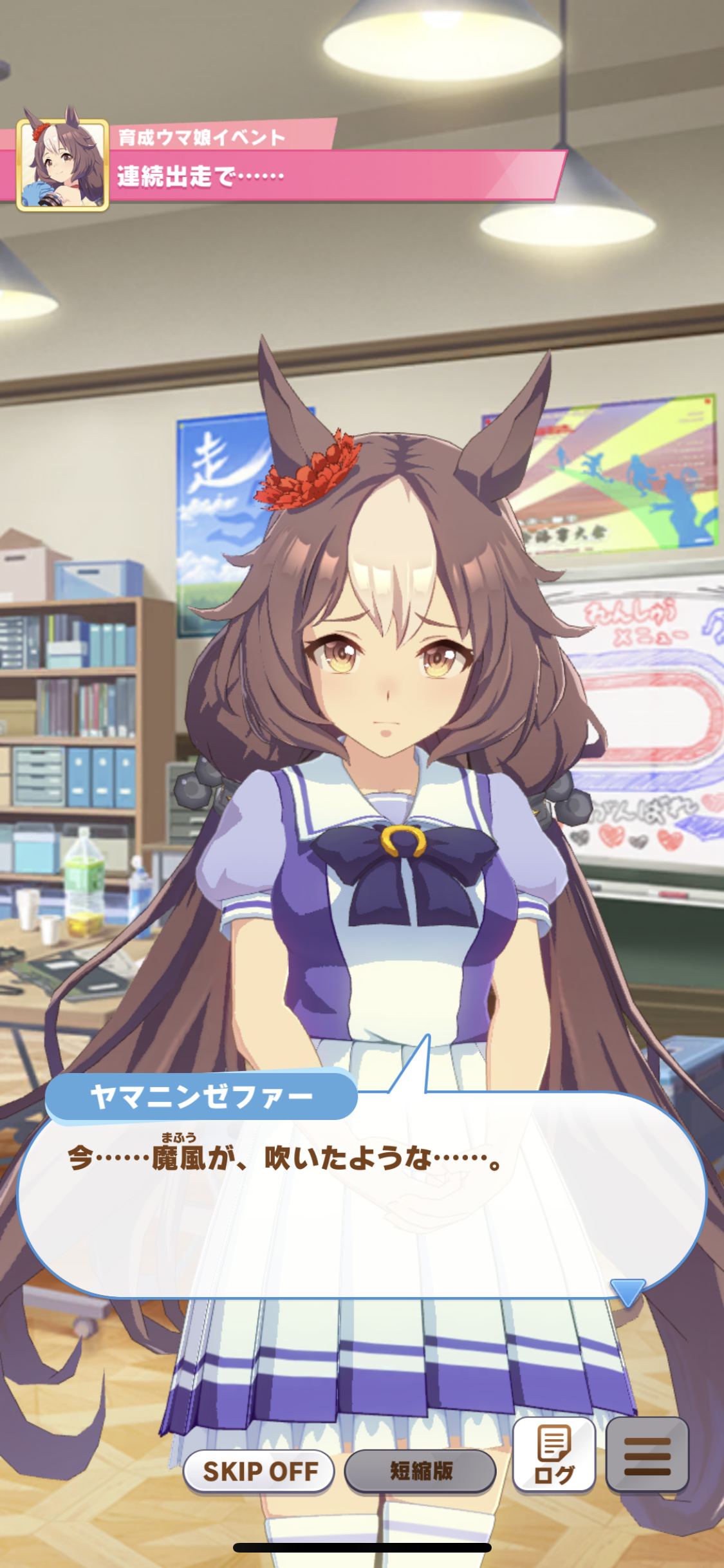 ヤマニンゼファーについて語っていいですか。ゼファーのストーリーは、「皇帝」に憧れるトウカイテイオーと「マイルの皇帝」に憧れるゼファーが、路線は違えど同期として互いに競い合い励まし合いながら夢に向かって進んでいく、というストーリーなんですが、それと同時に、それまで他者と必要以上に関わろうとせず一人で生きていたゼファーがテイオーの影響によって周囲の人々の存在に目を向けるようになり、精神的に成長していくというストーリーでもあるんです。