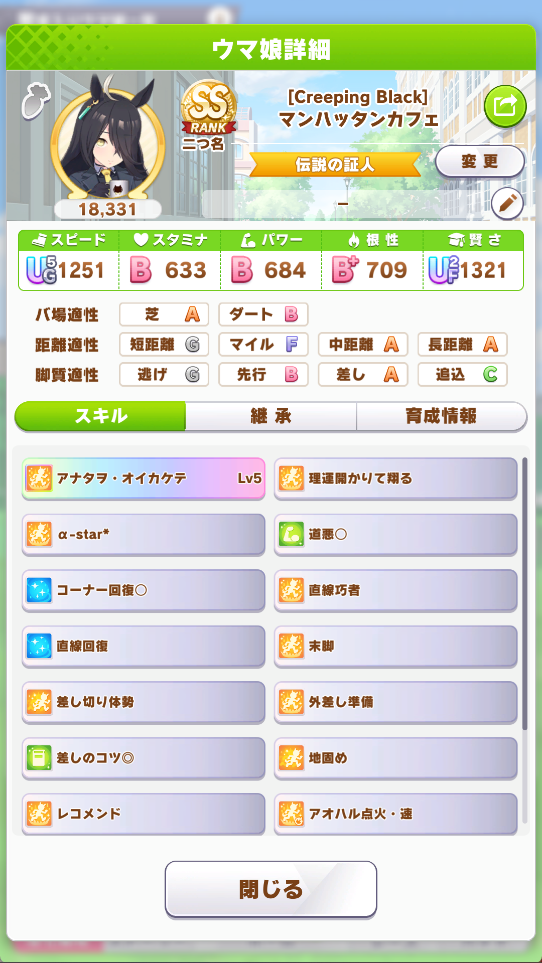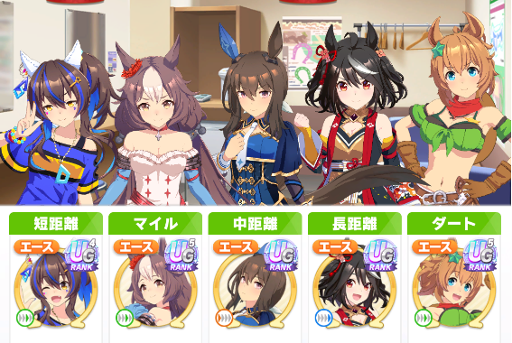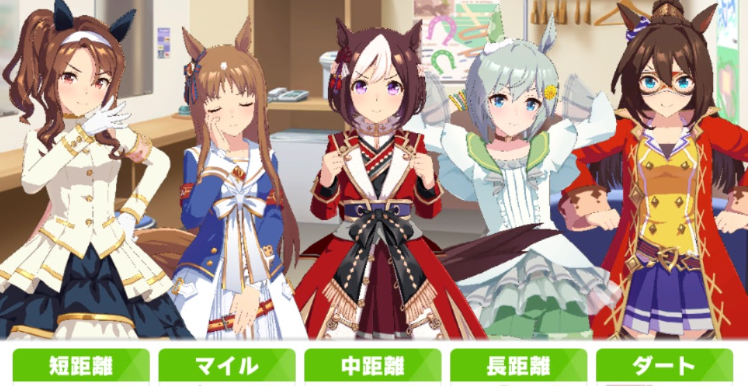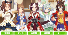 短距離:マーちゃん マイル:ライス 中距離:ダイヤ 長距離:カフェ ダート:デジたん