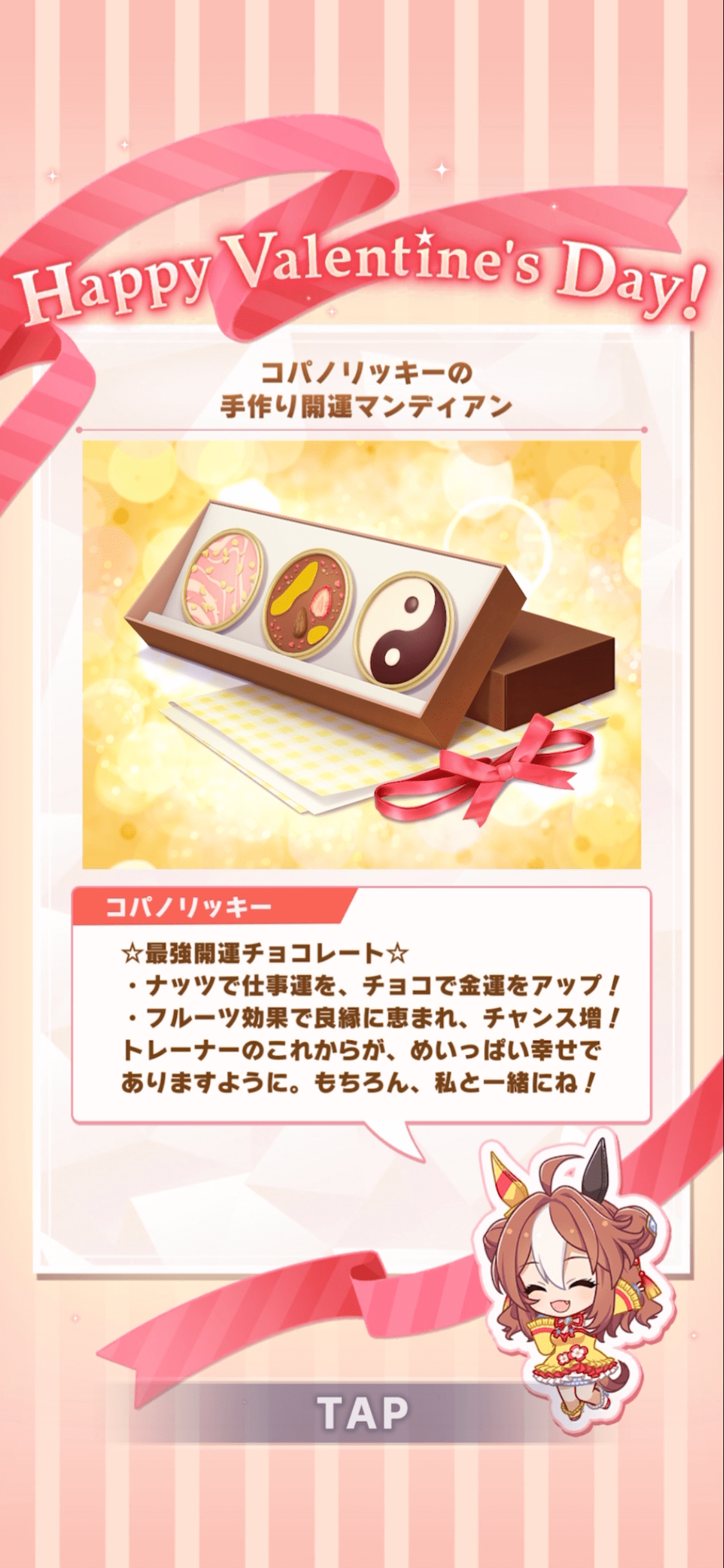 ・バレンタインキャンペーンの「特別チョコ」の受け取り演出において、一部ウマ娘の演出が意図しない内容になっている。
