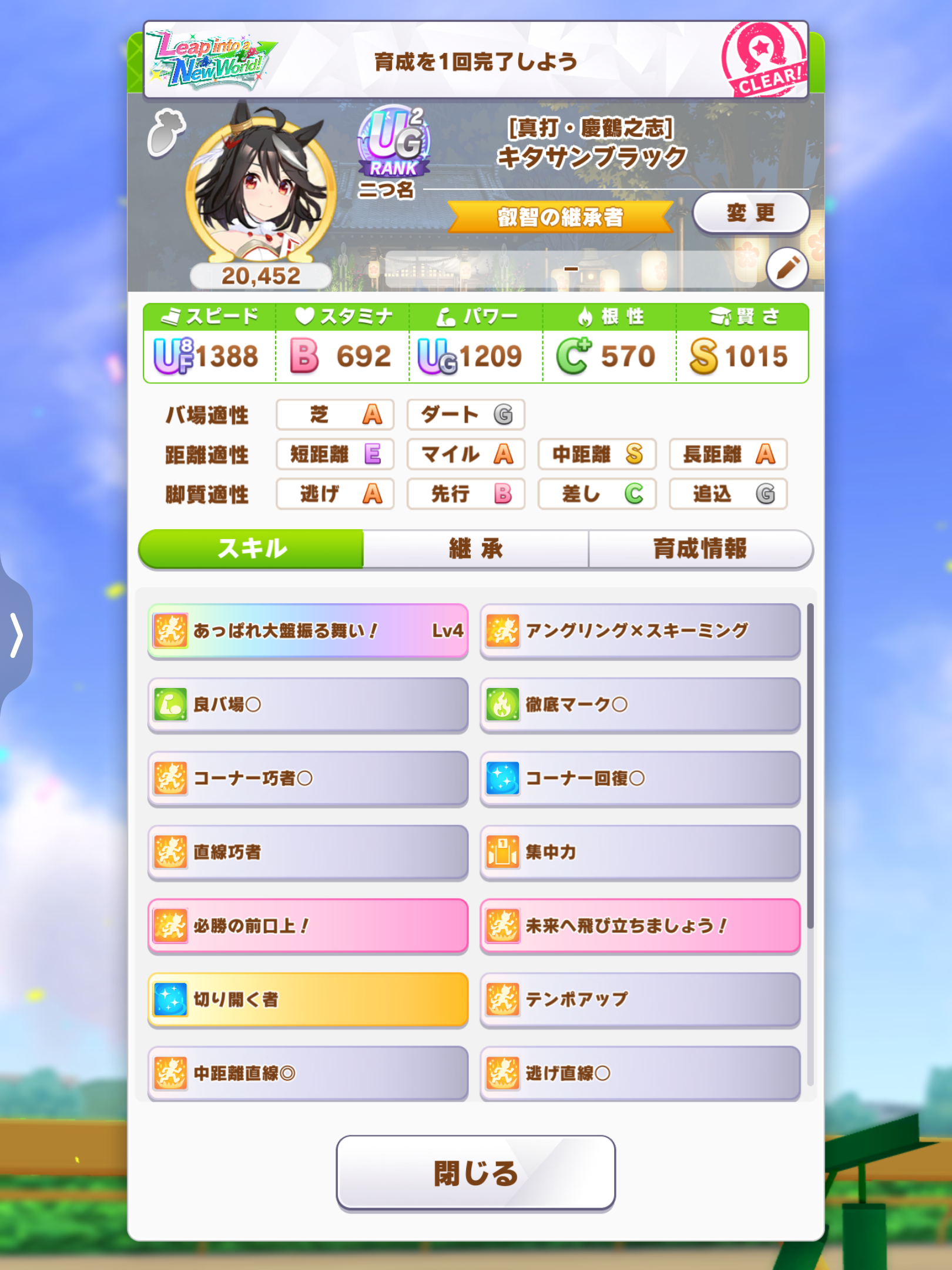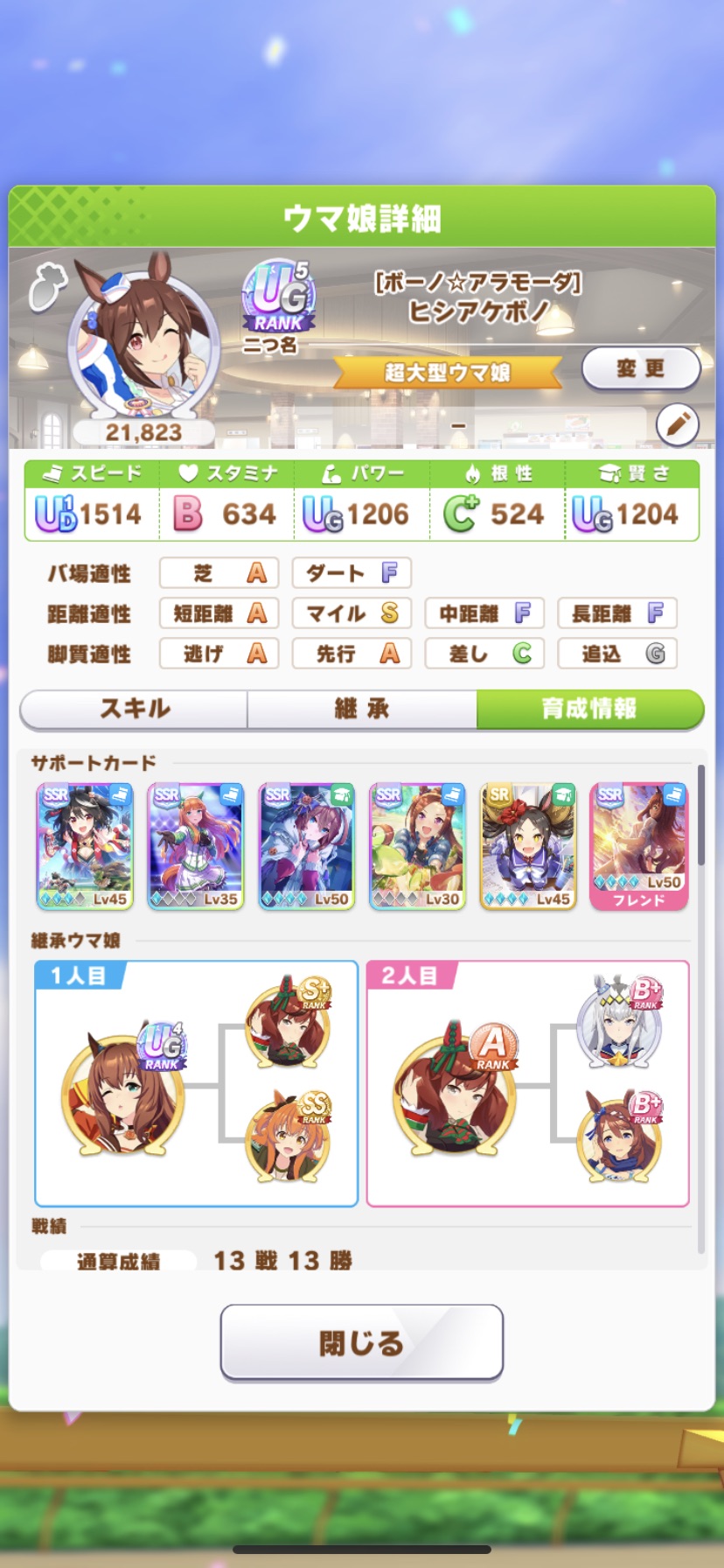距離S付いたのに夏合宿友情トレ一回のみ、最後の5ターンでまさかの0回をかました伝説のキタサンがこちら