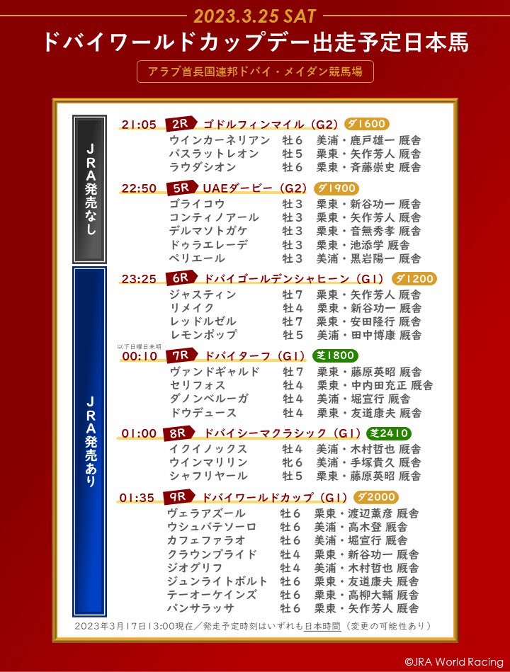 ドバイワールドカップデー出走馬一覧表