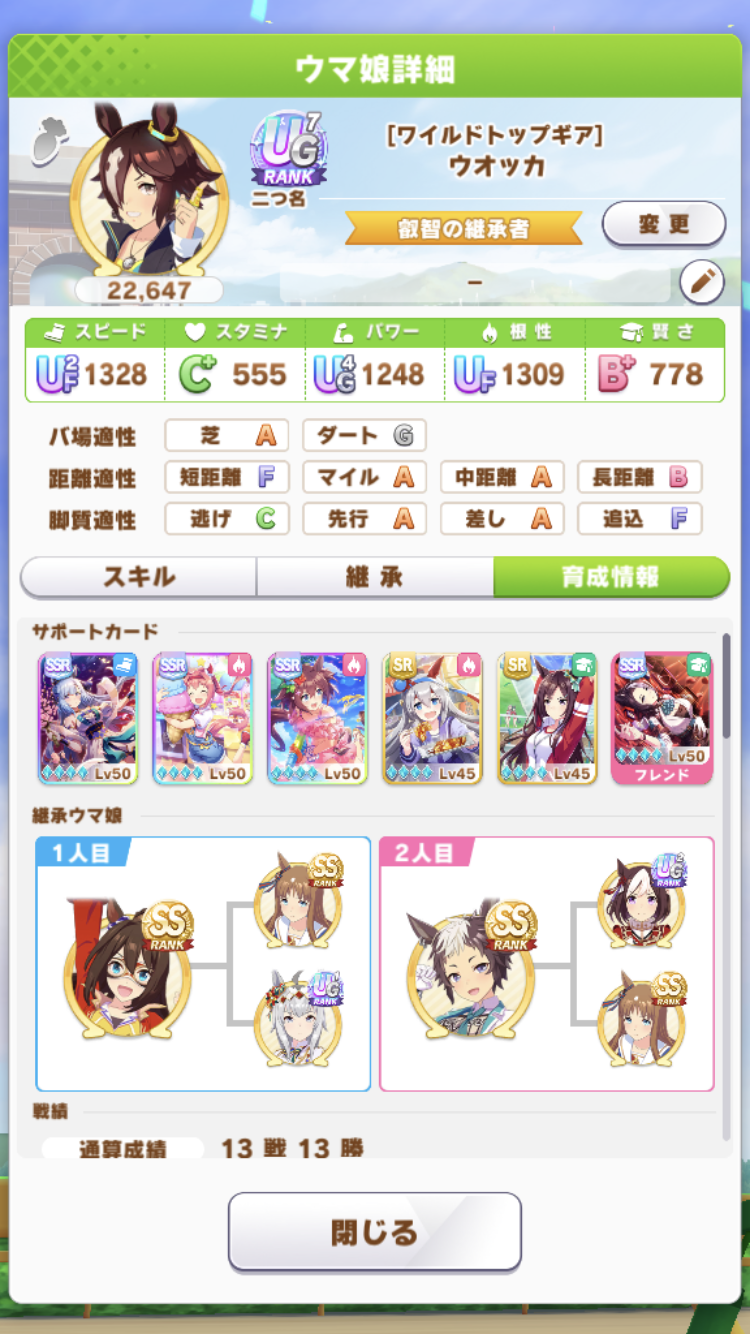 スピが溢れそうな気がする。パワーや根性を混ぜるといいかも。根性は配布が強いので差が出にくくていいぞ