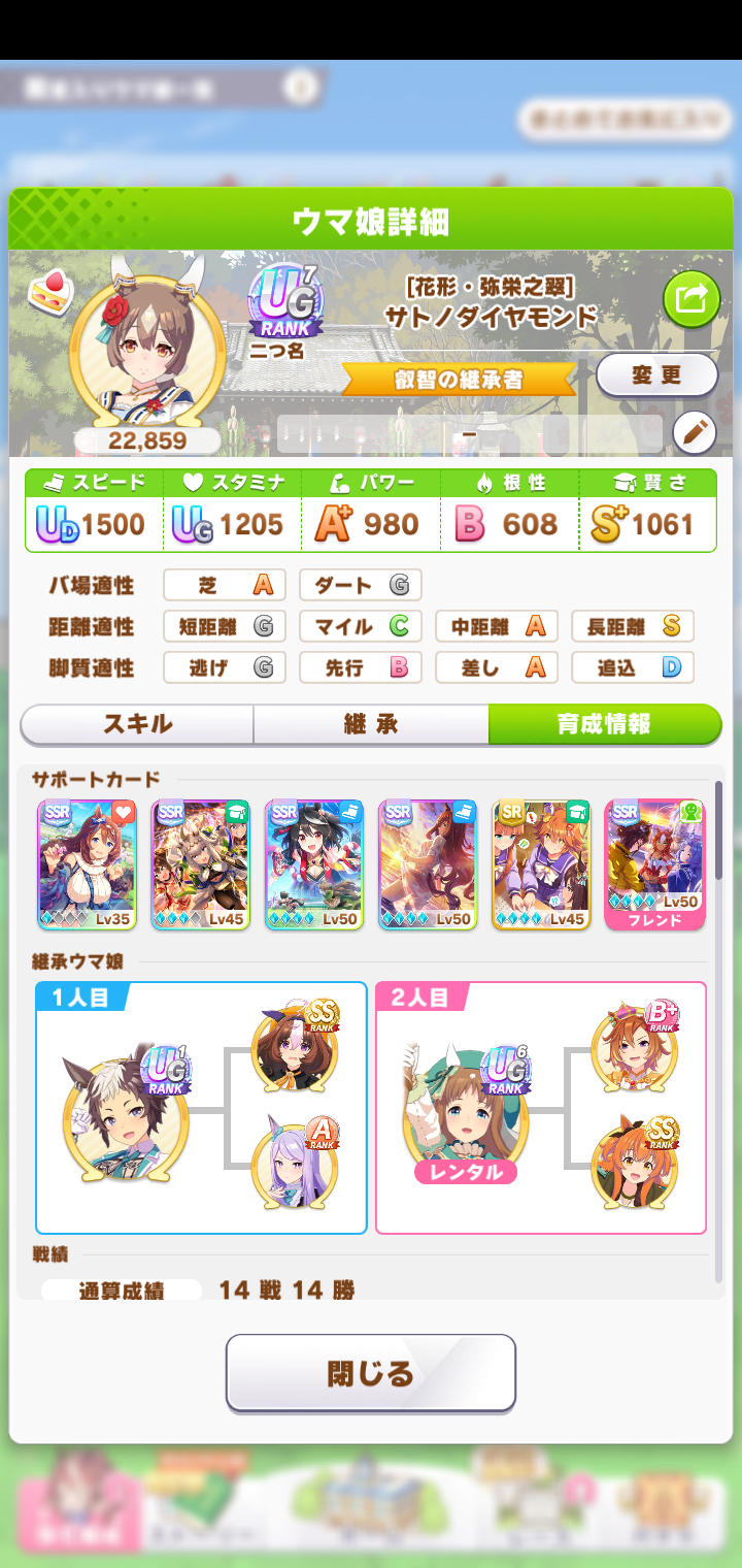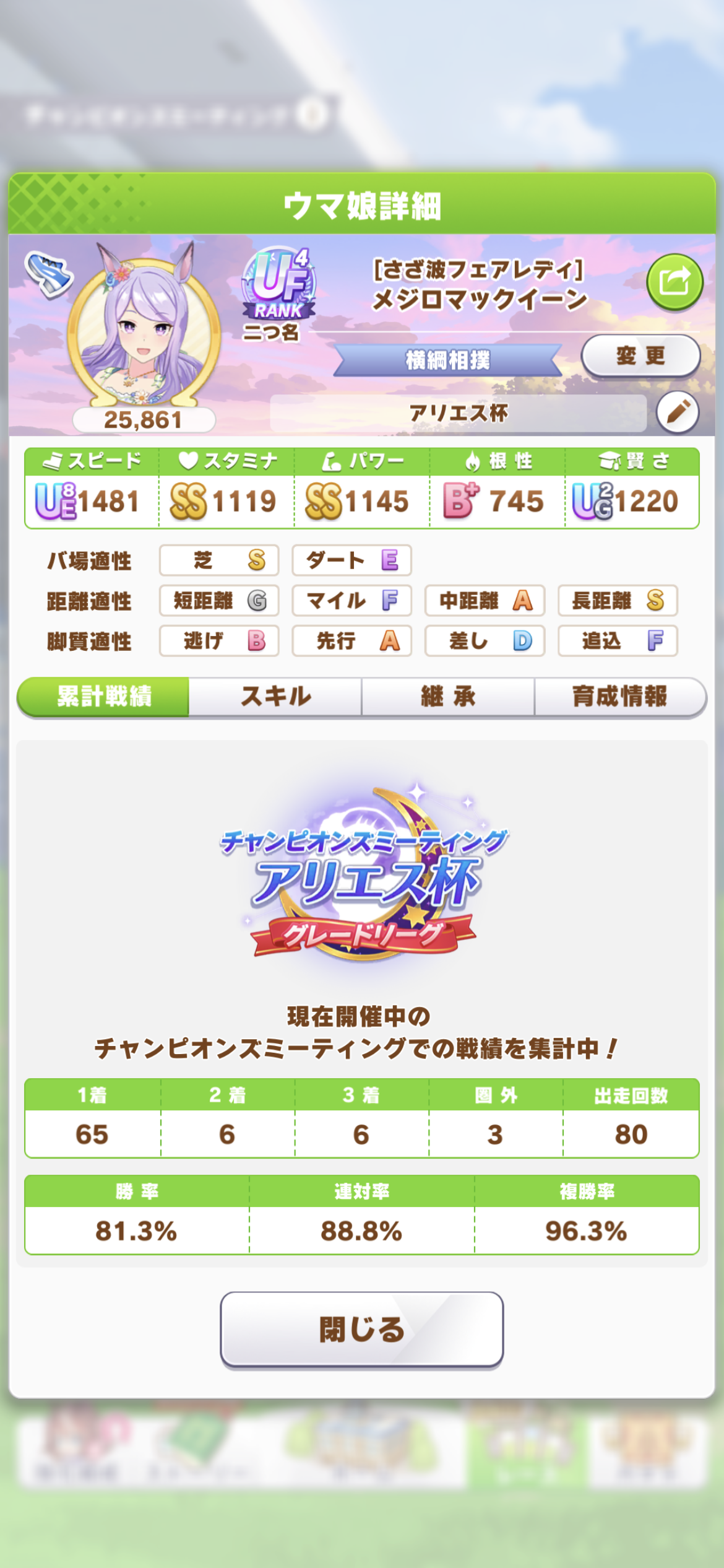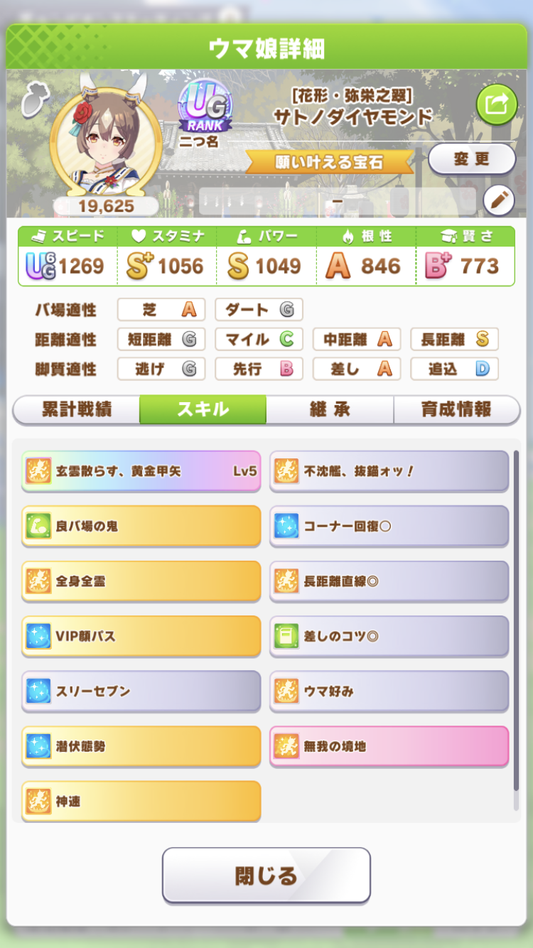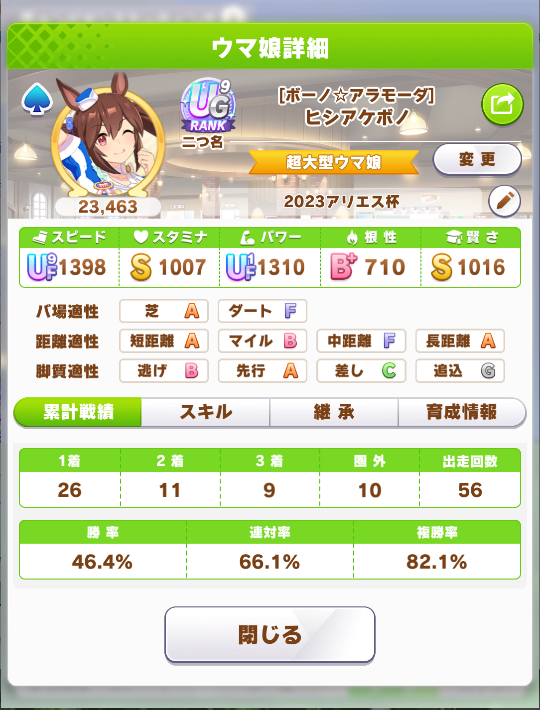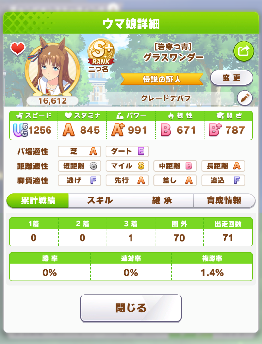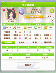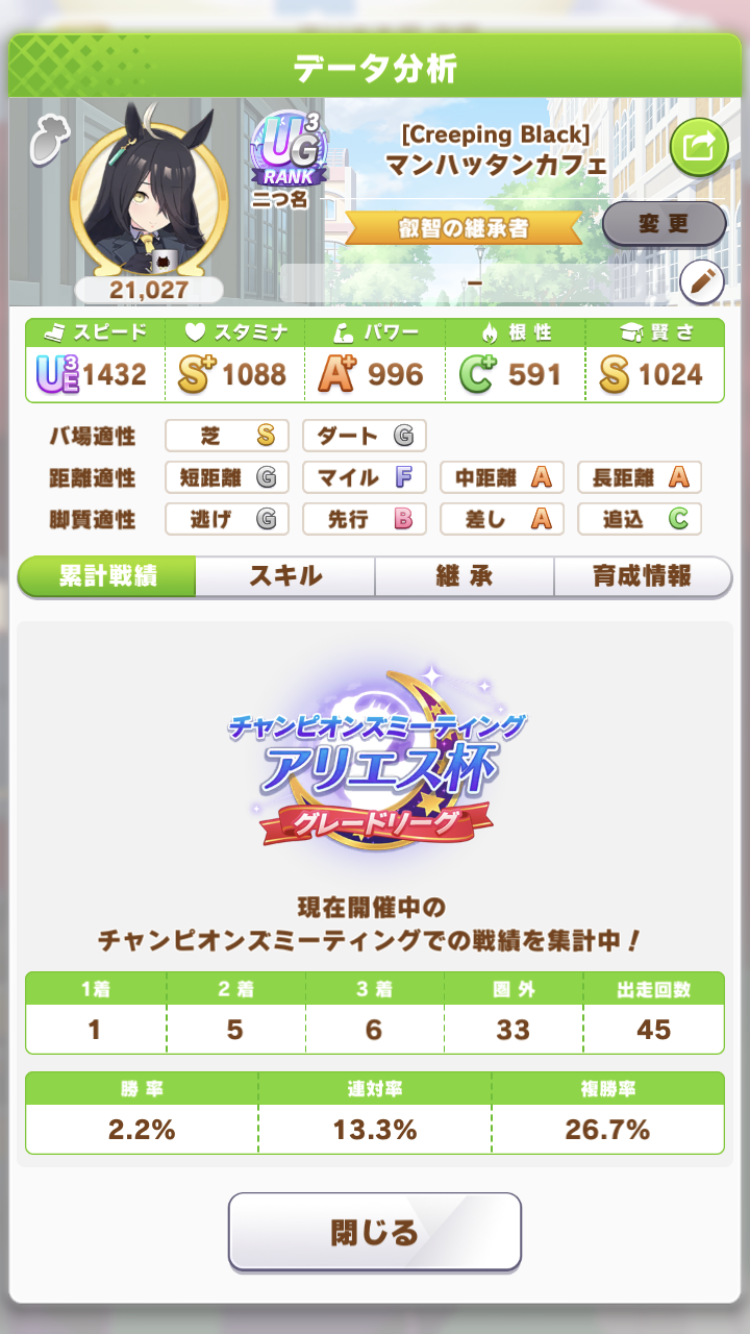 戦績少し少なめなのは3日目で仕切り直したやつだから(1,2日目はステ控えめ芝S長距離Sのブライト