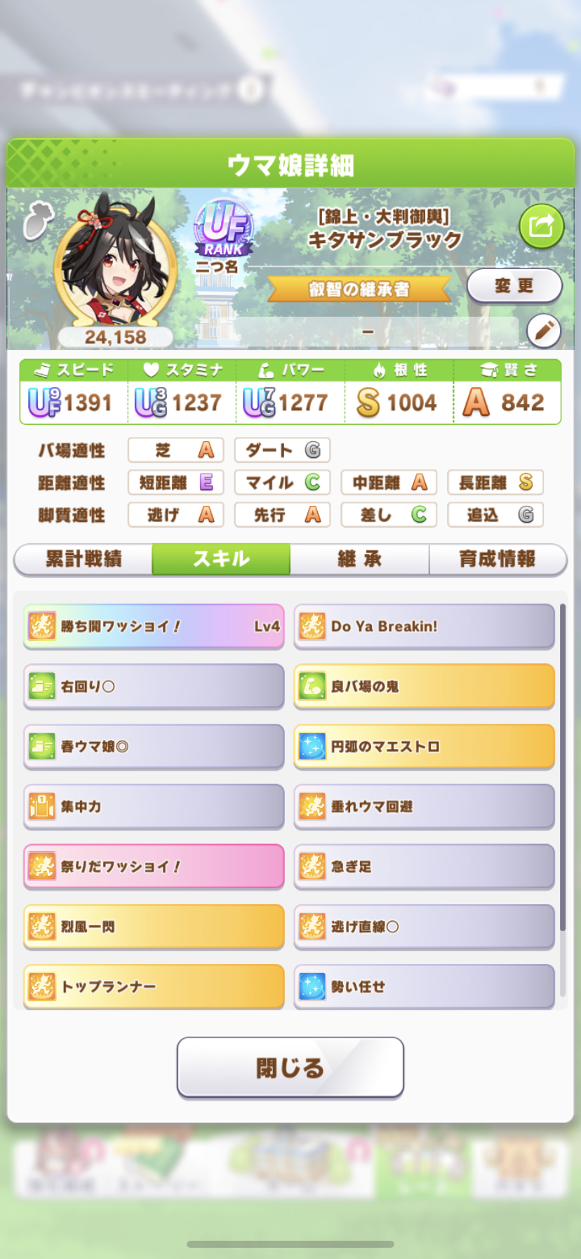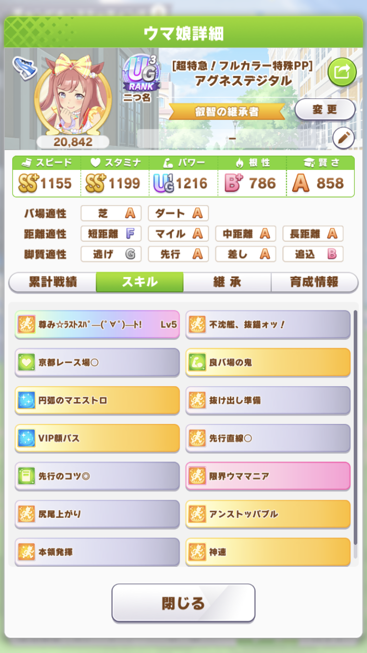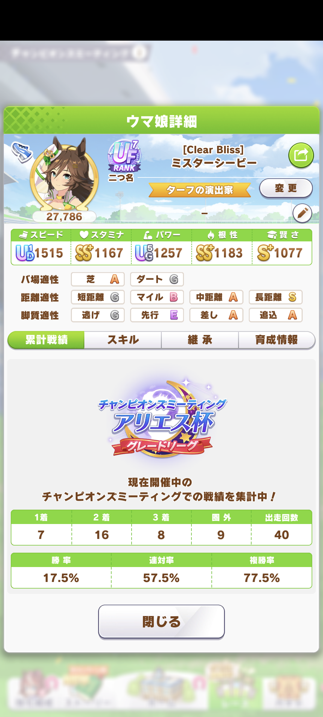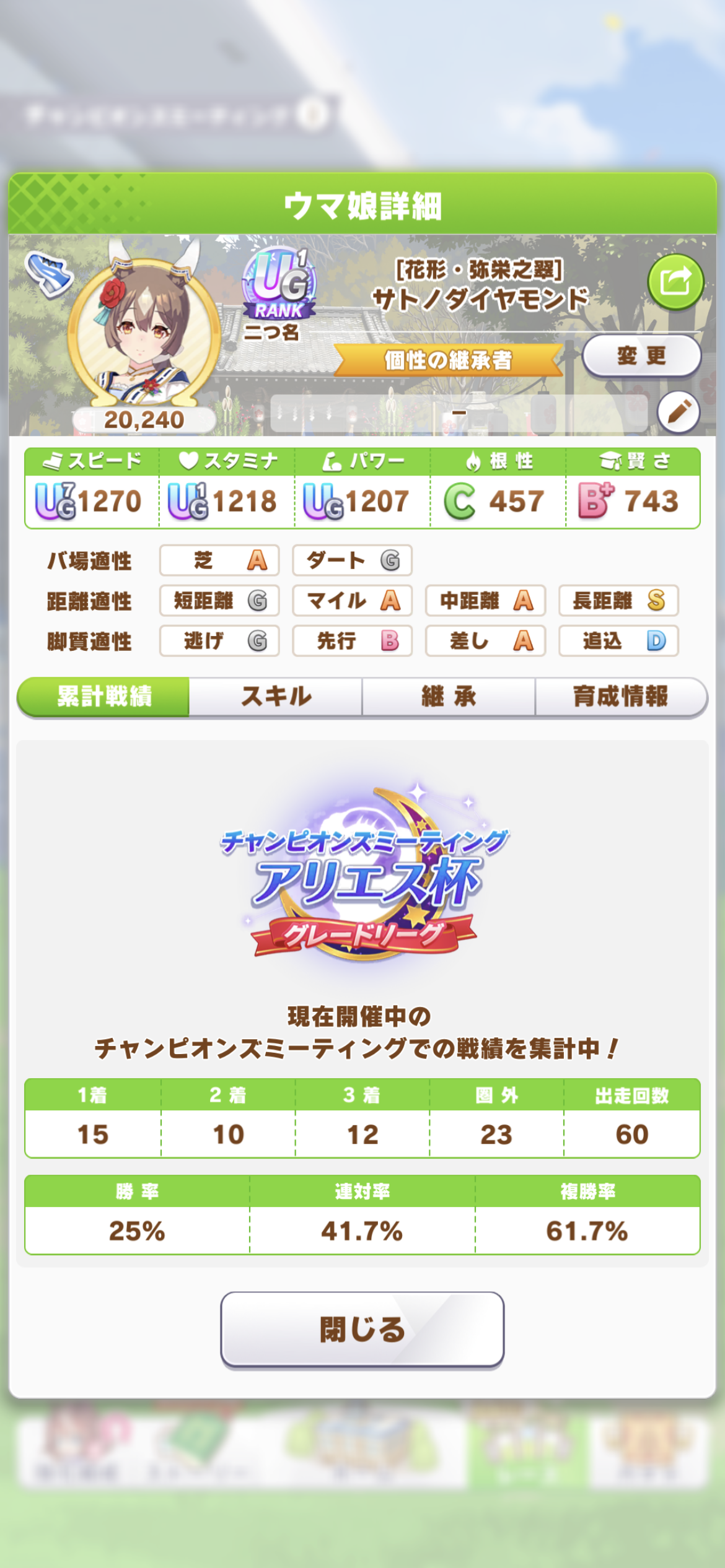 戦績少し少なめなのは3日目で仕切り直したやつだから(1,2日目はステ控えめ芝S長距離Sのブライト