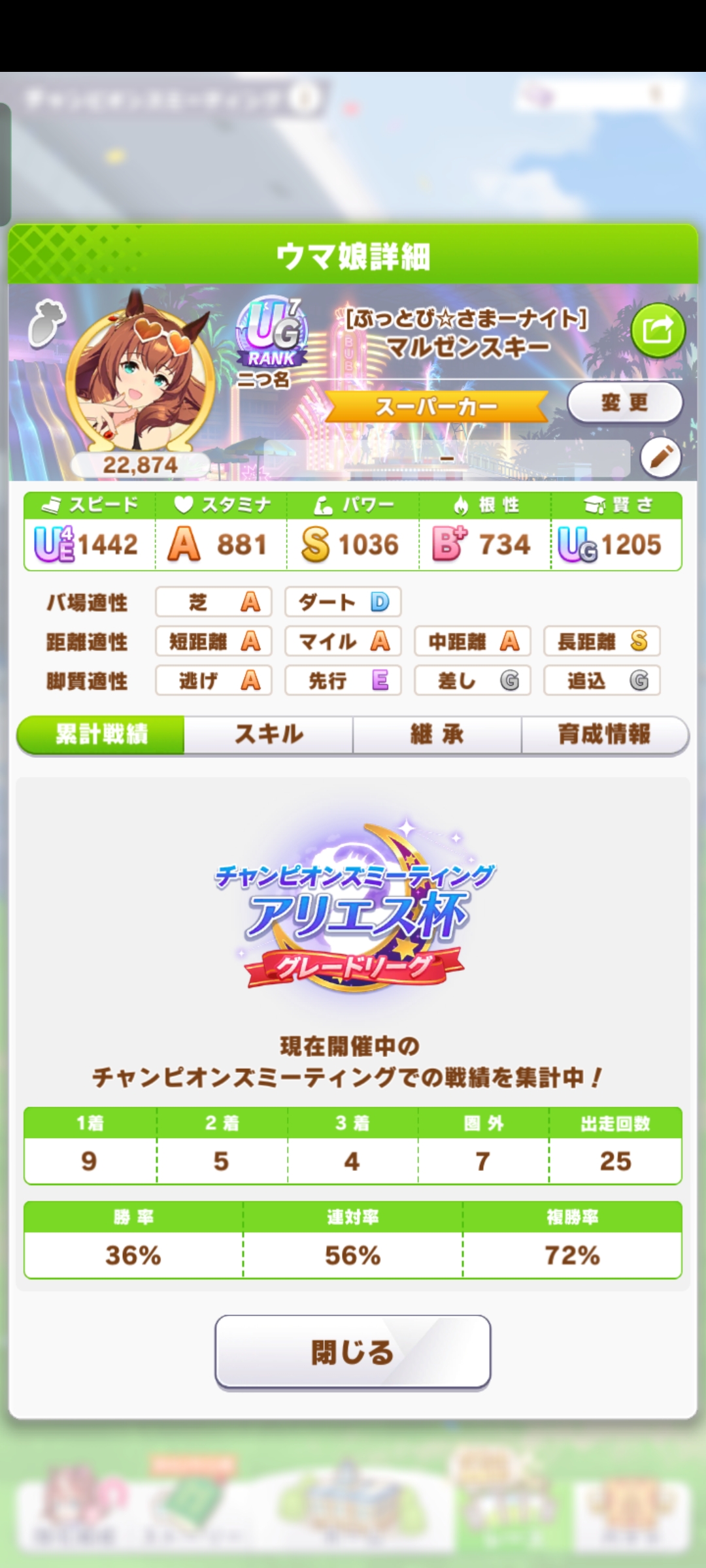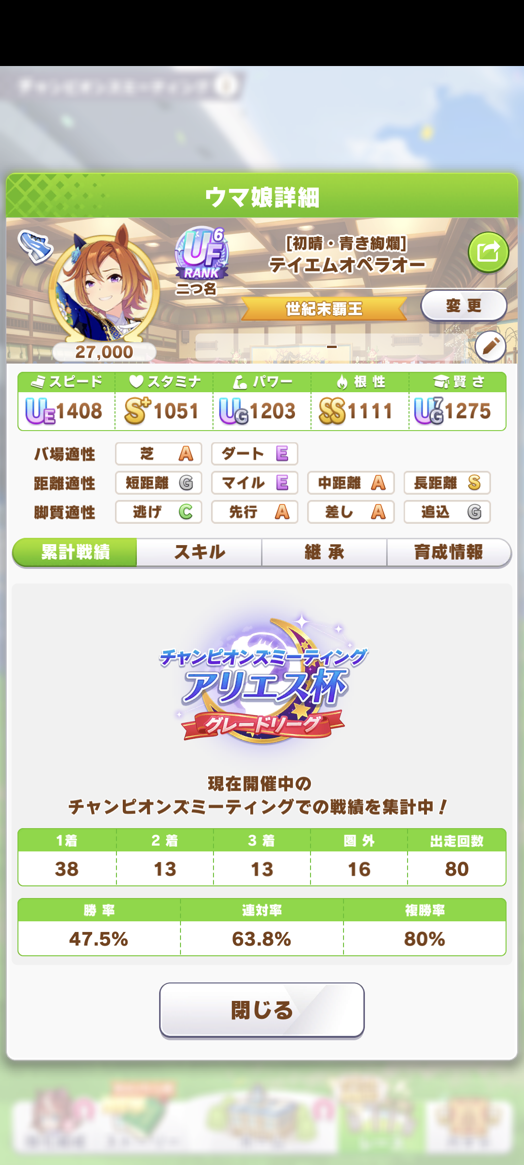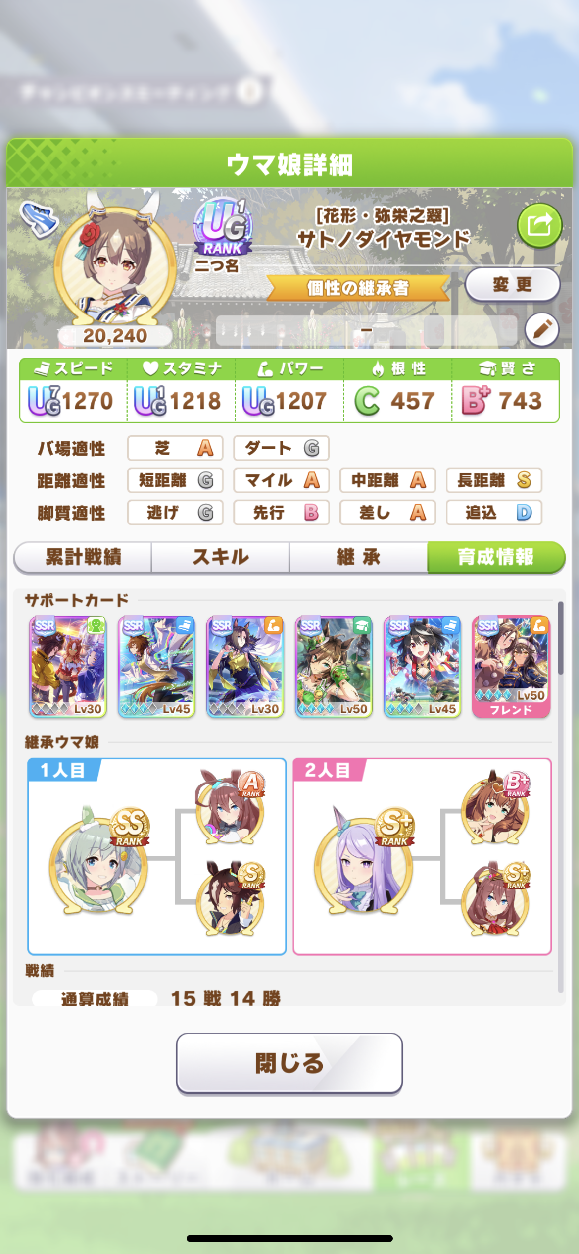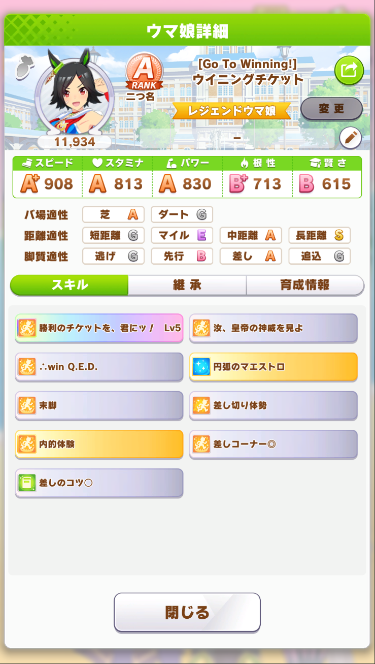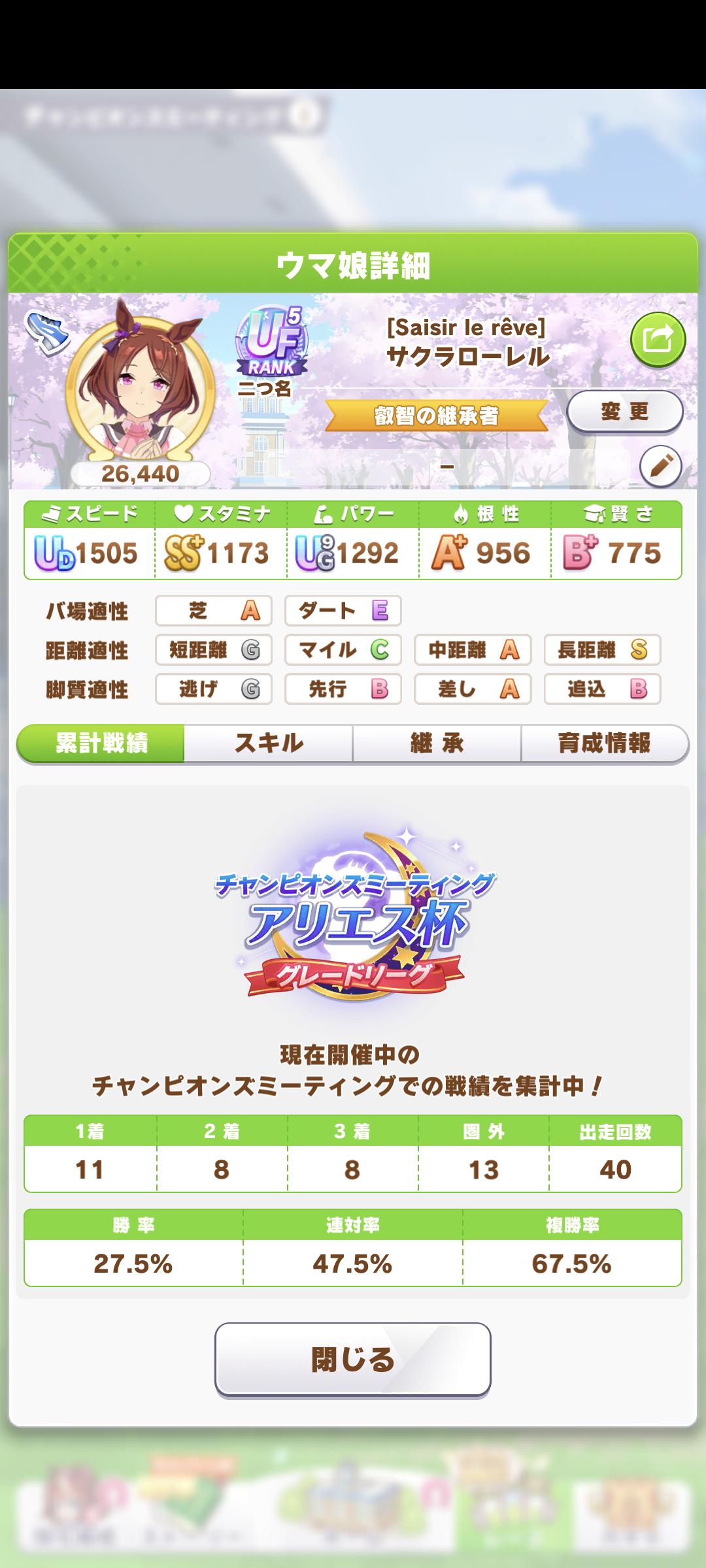 戦績少し少なめなのは3日目で仕切り直したやつだから(1,2日目はステ控えめ芝S長距離Sのブライト