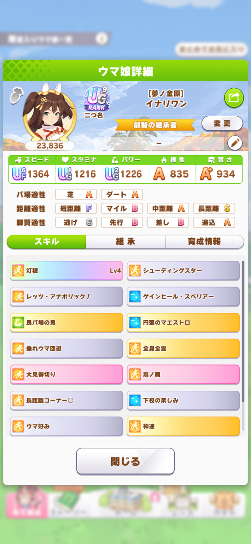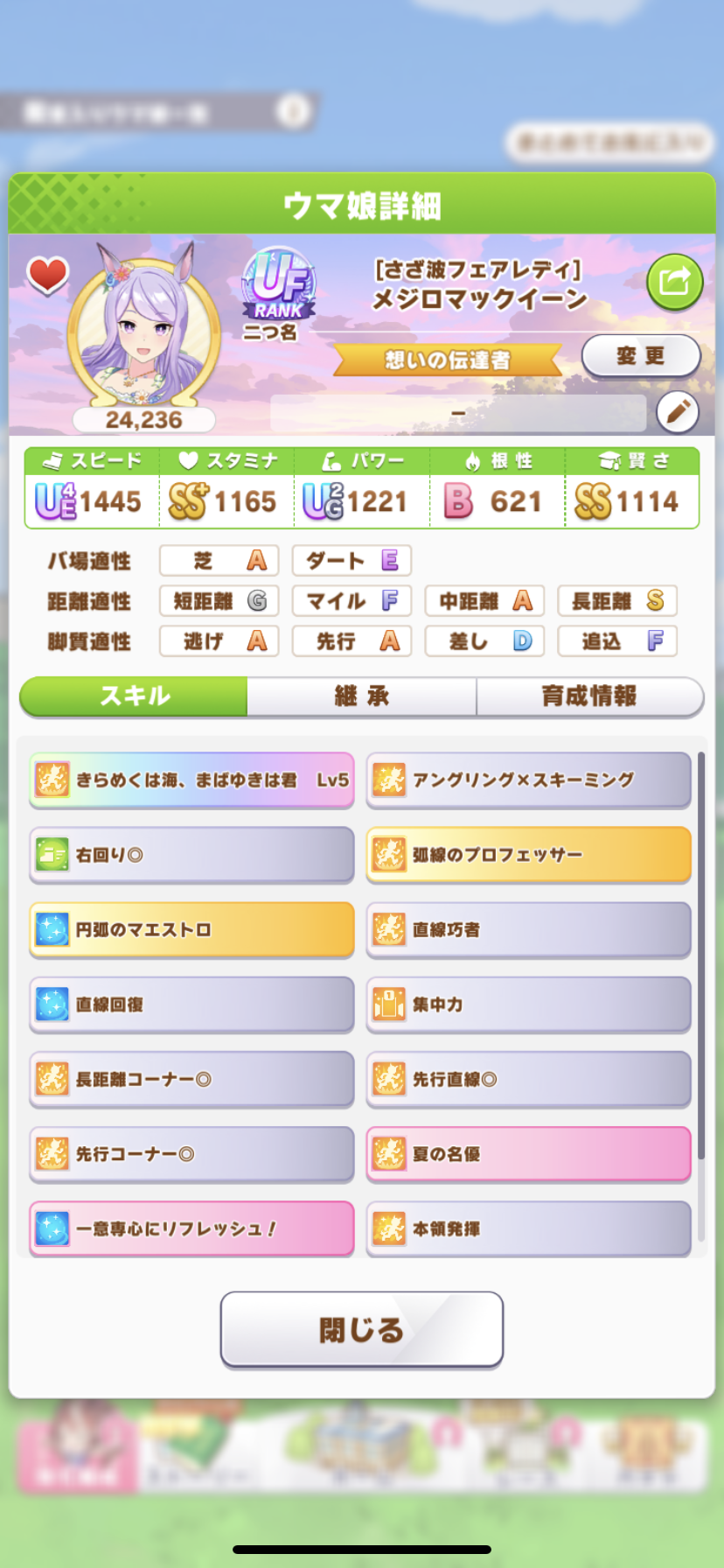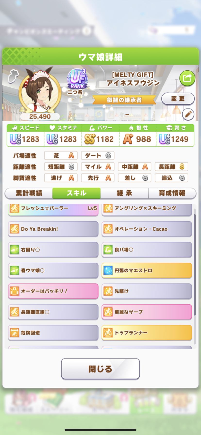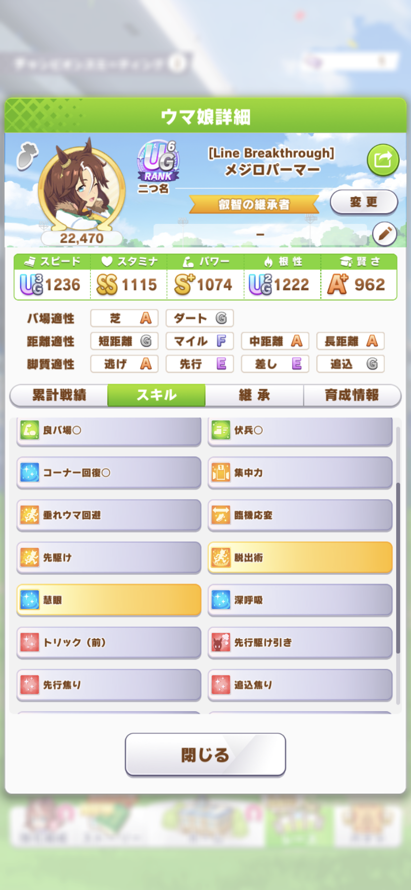 戦績少し少なめなのは3日目で仕切り直したやつだから(1,2日目はステ控えめ芝S長距離Sのブライト