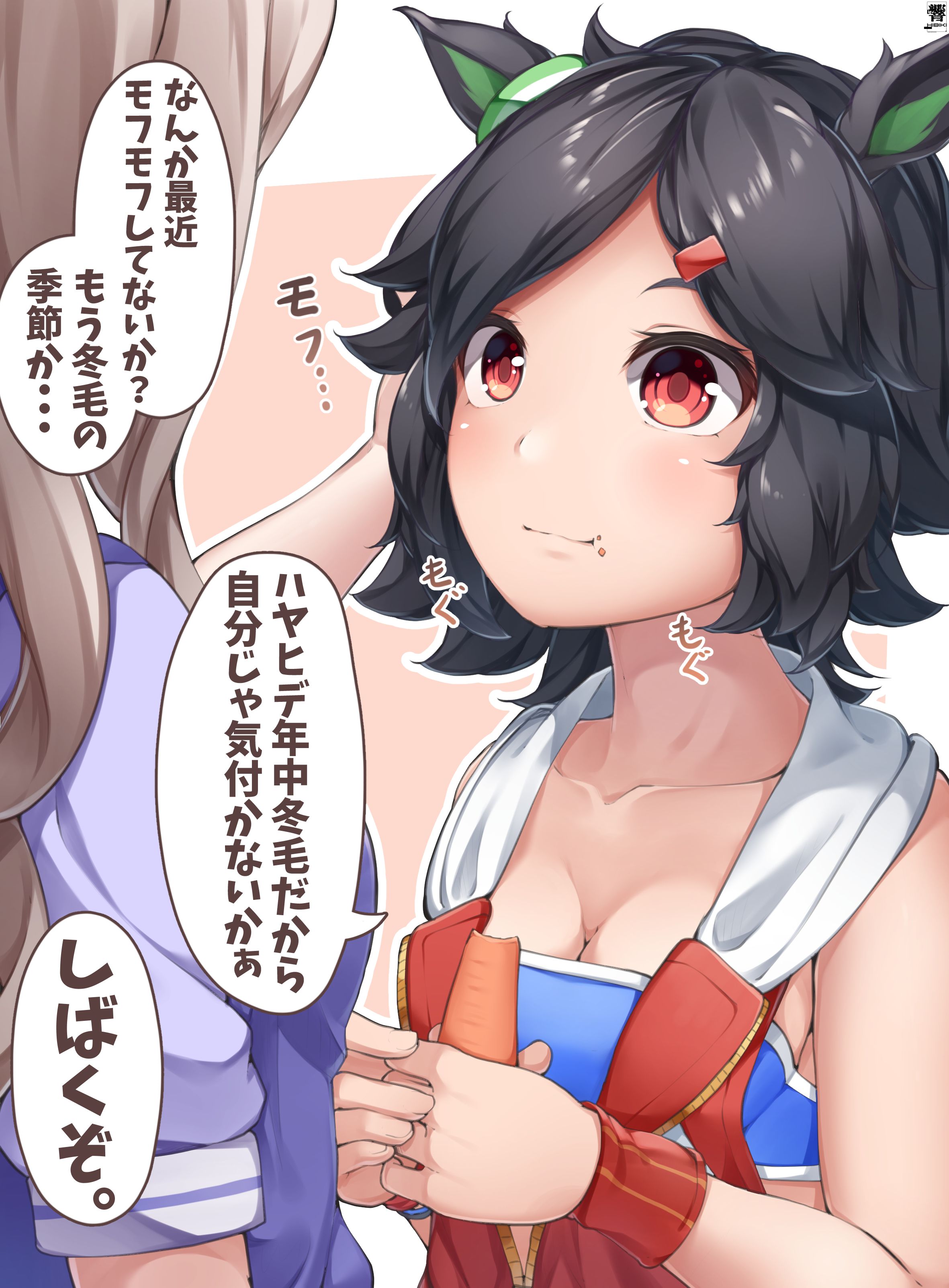 そういうハヤヒデの側には彼女の身長程まで積まれた抜けた芦毛の山が鎮座していた。ヘアブラッシングで筋肉痛になりそうになったのは初めての経験だった。