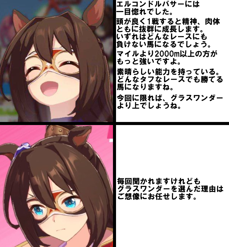 対してグラスワンダーは常に足元に不安を抱えており、調子も上がりづらいウマ娘で、調整が難しい 重度の骨折を経て、これからの成長どころか怪我前の状態に戻ることすら疑わしかった