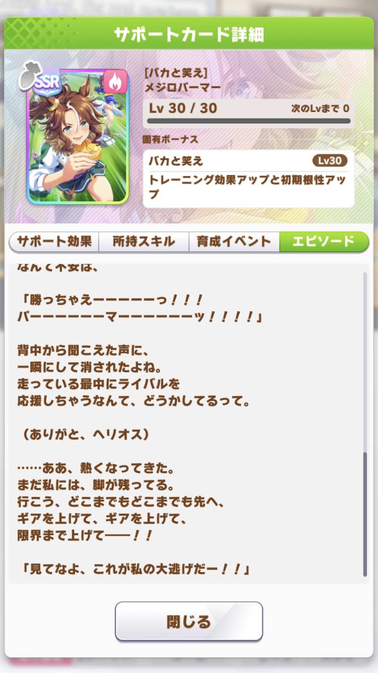 この2枚(キャラの脚質次第でゼファー→ウララ)で根性育成したら一気に評価点跳ね上がったわ