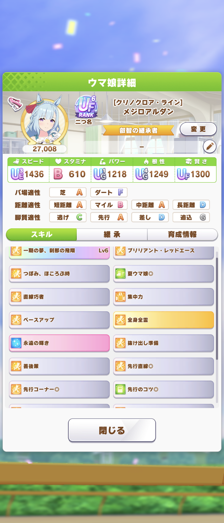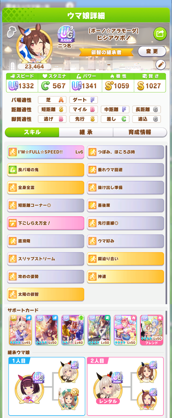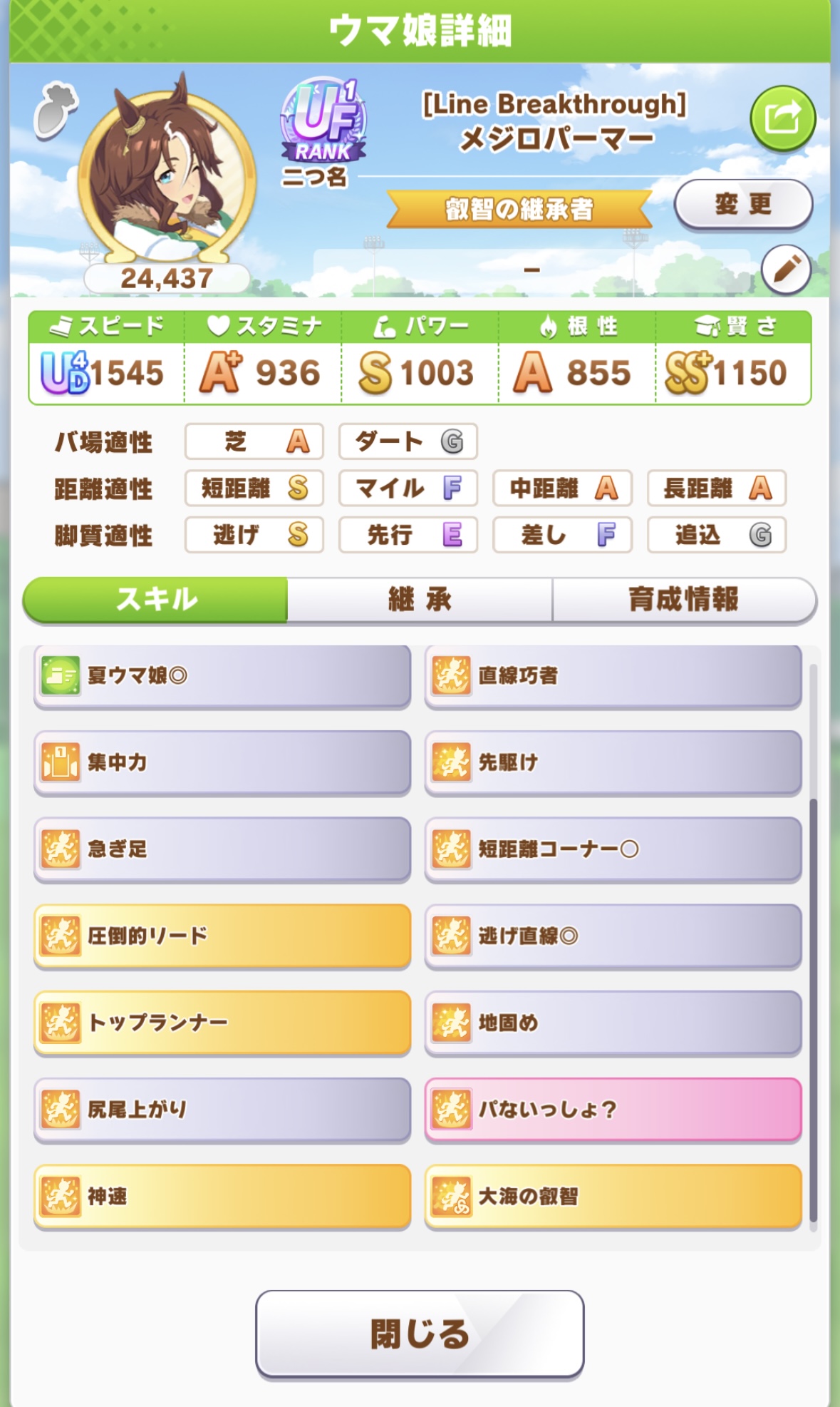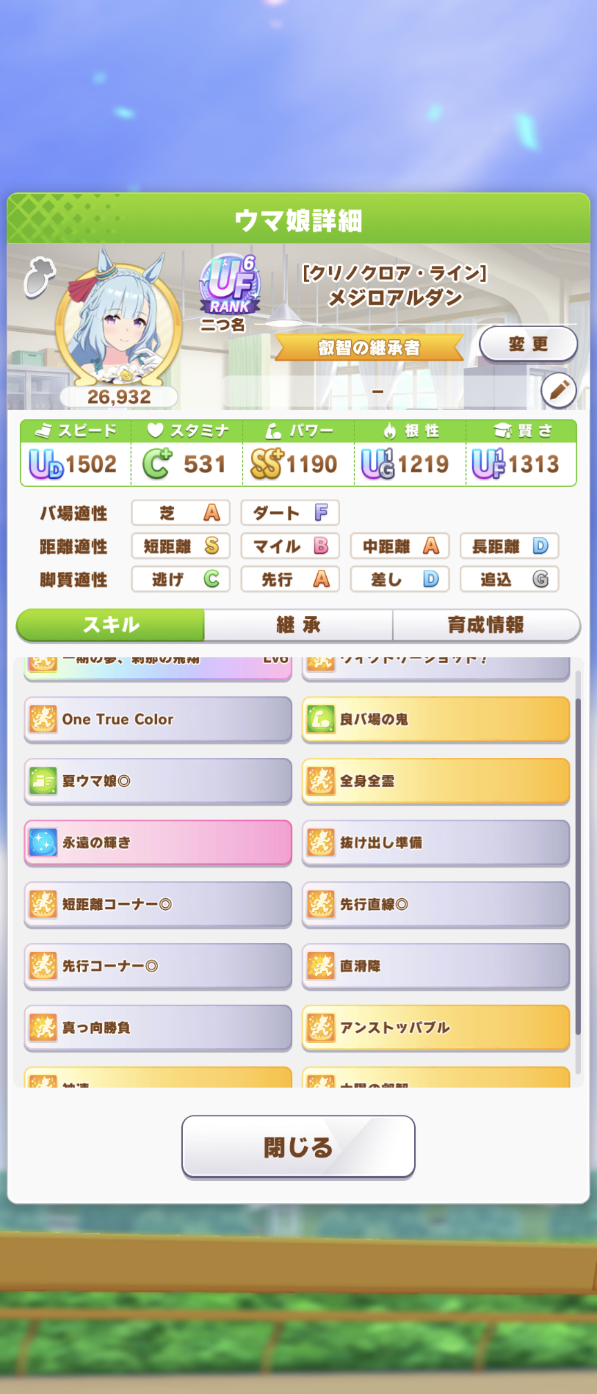 逃げで育ててたマーチャンを育成完了直前、最後スキルだけ取る場面で気の迷いから先行運用に変えてしまった…