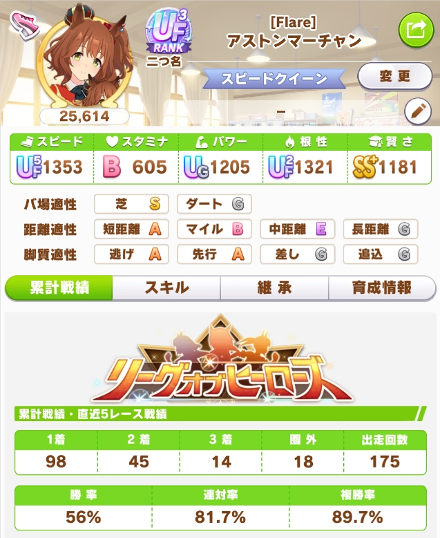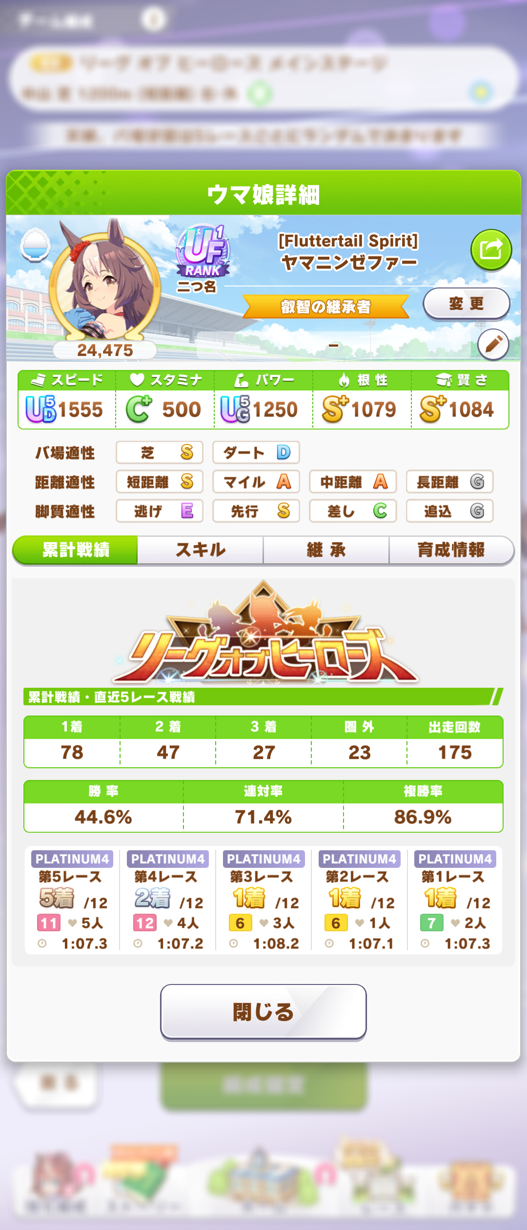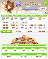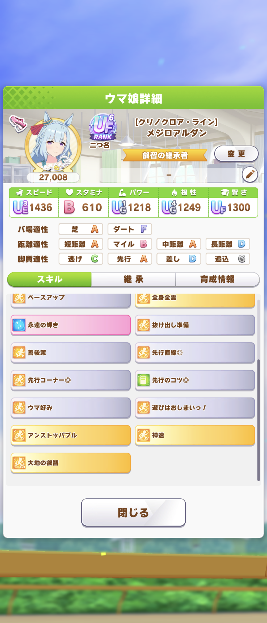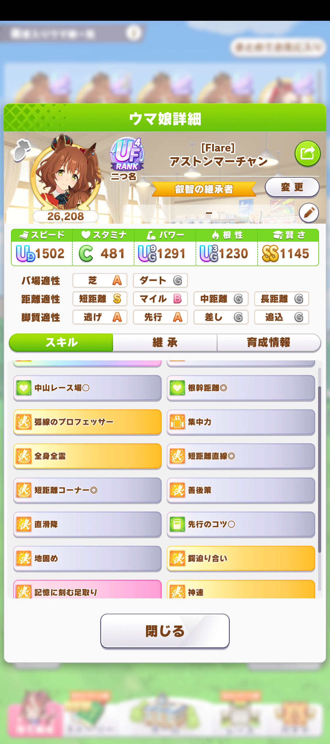 逃げで育ててたマーチャンを育成完了直前、最後スキルだけ取る場面で気の迷いから先行運用に変えてしまった…