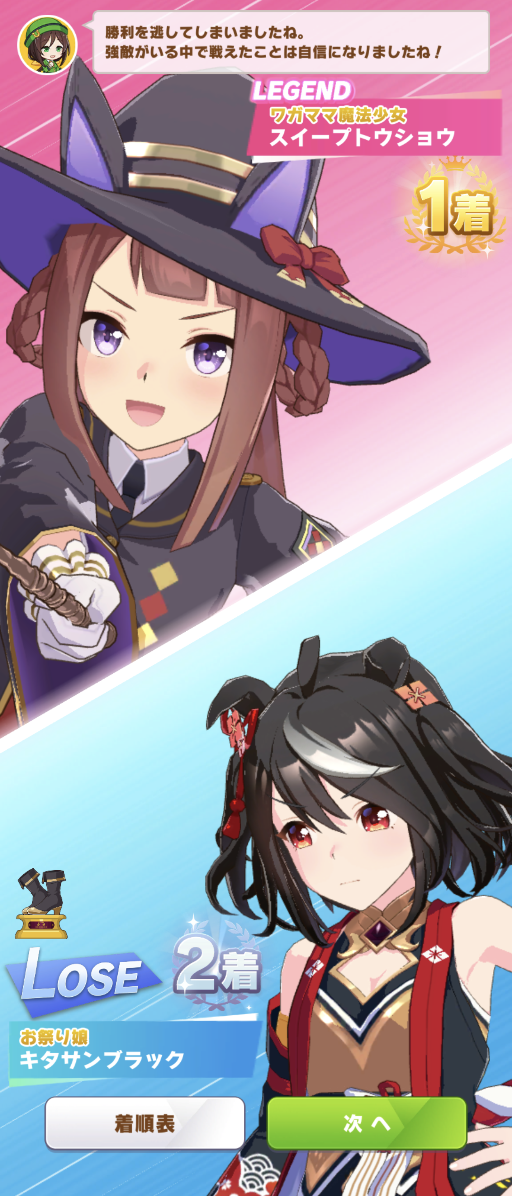 このキタちゃんは脚質逃げなのにスイーピーの後ろについて匂いを楽しんでいたらレースが終わっちゃったのかな